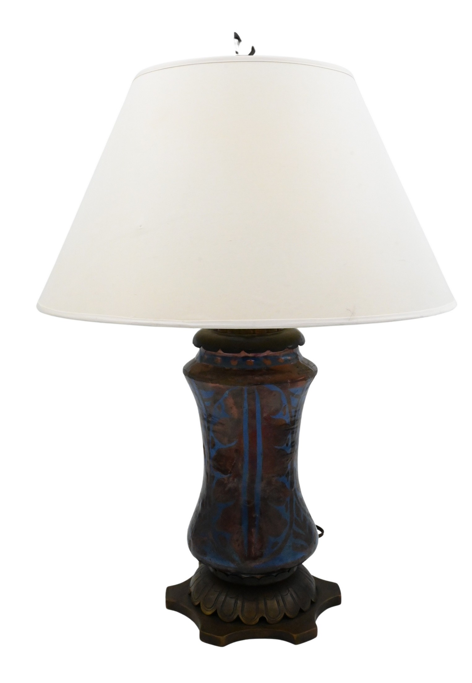 having deep blue body accented with fern and leaf lustre motif, now mounted as table lamp