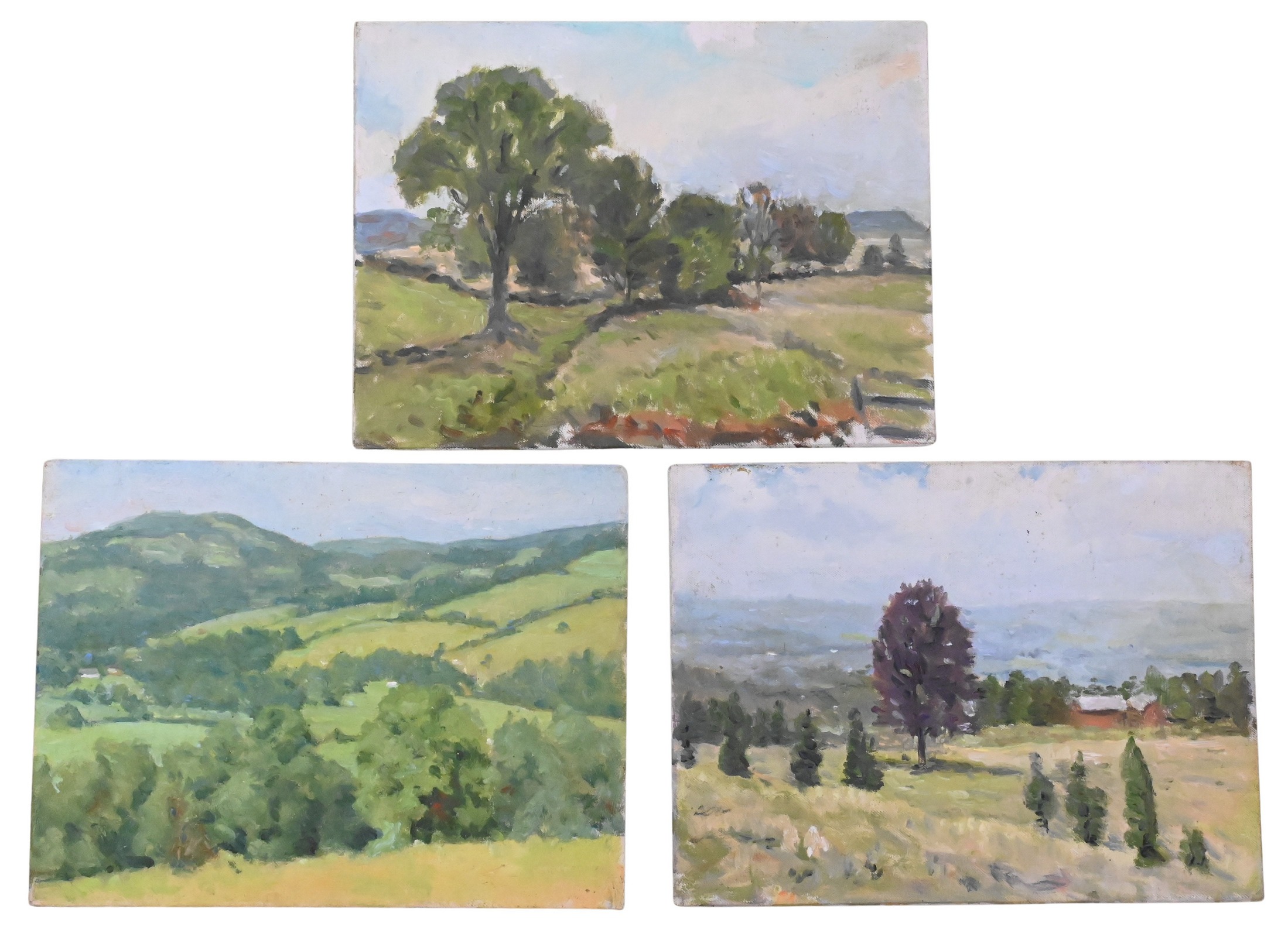 one study of a farm with red barns and pines, one with trees and stone walls, along with one of rolling hills and trees