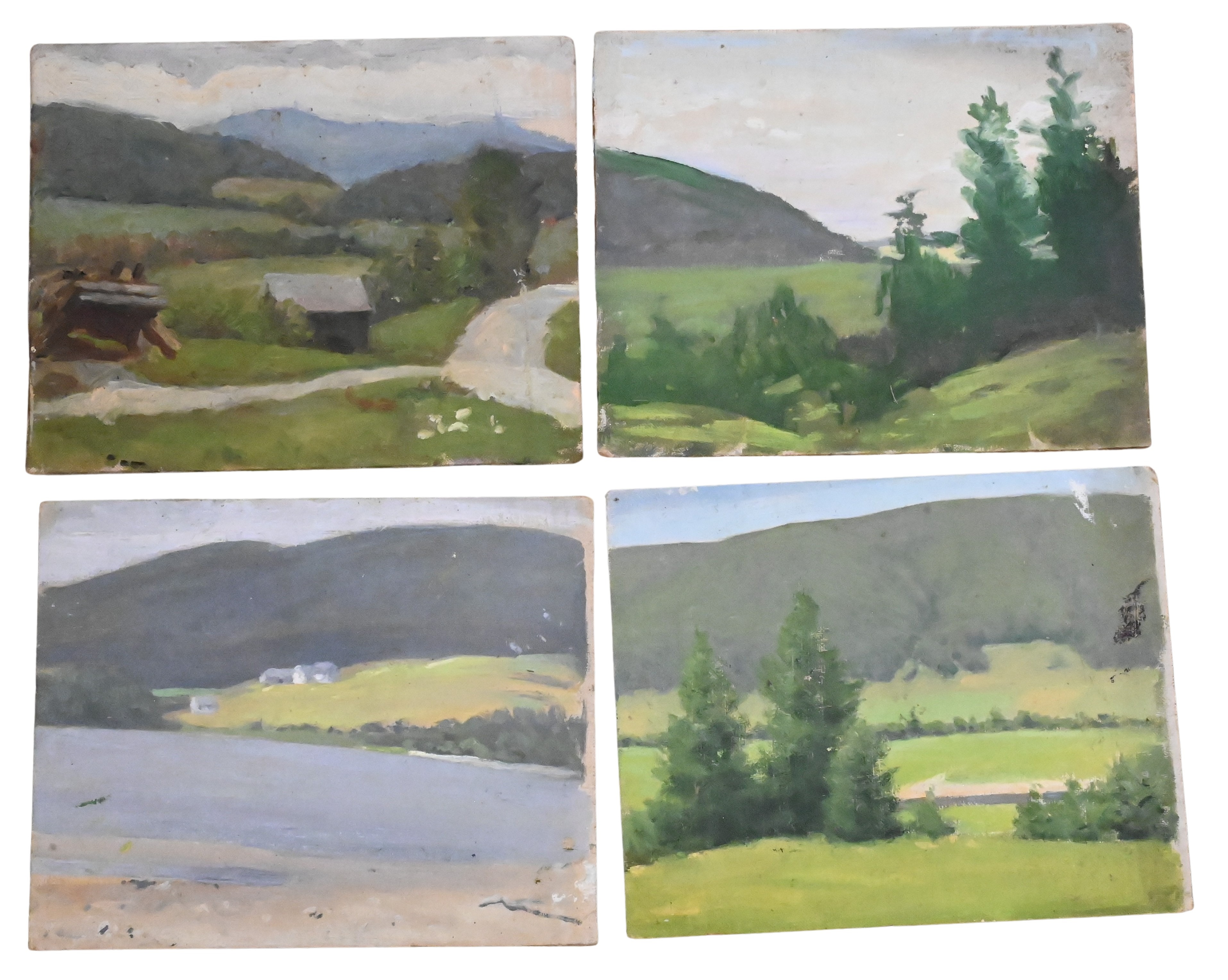 two studies of rolling hills and trees, one of a valley and small house along with one of a coastal village by the sea