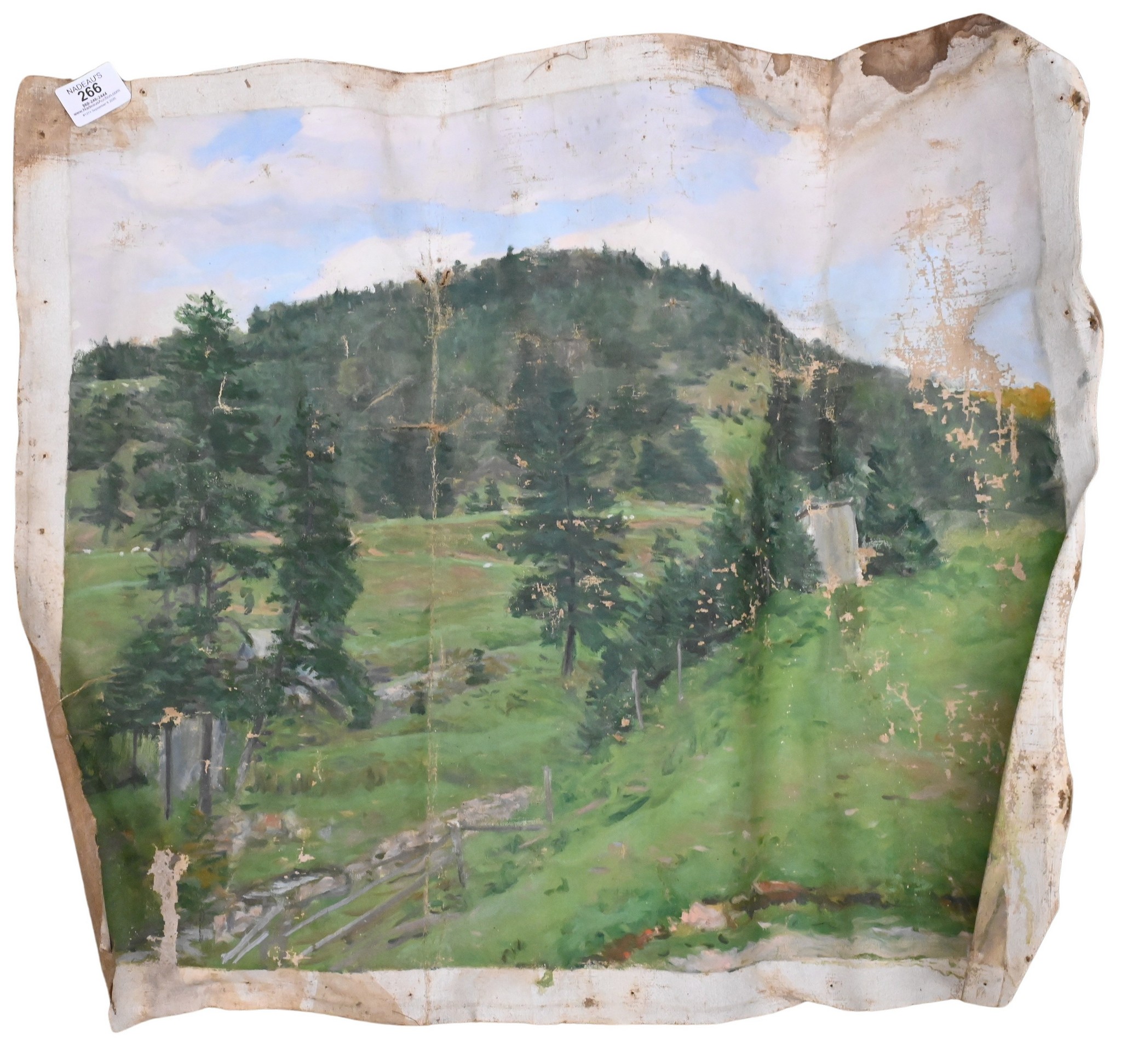 one large study of rolling hills and stone walls with chickens and cows, one of a farmhouse, row boats docked on a river, underbrush study, winding path etc…