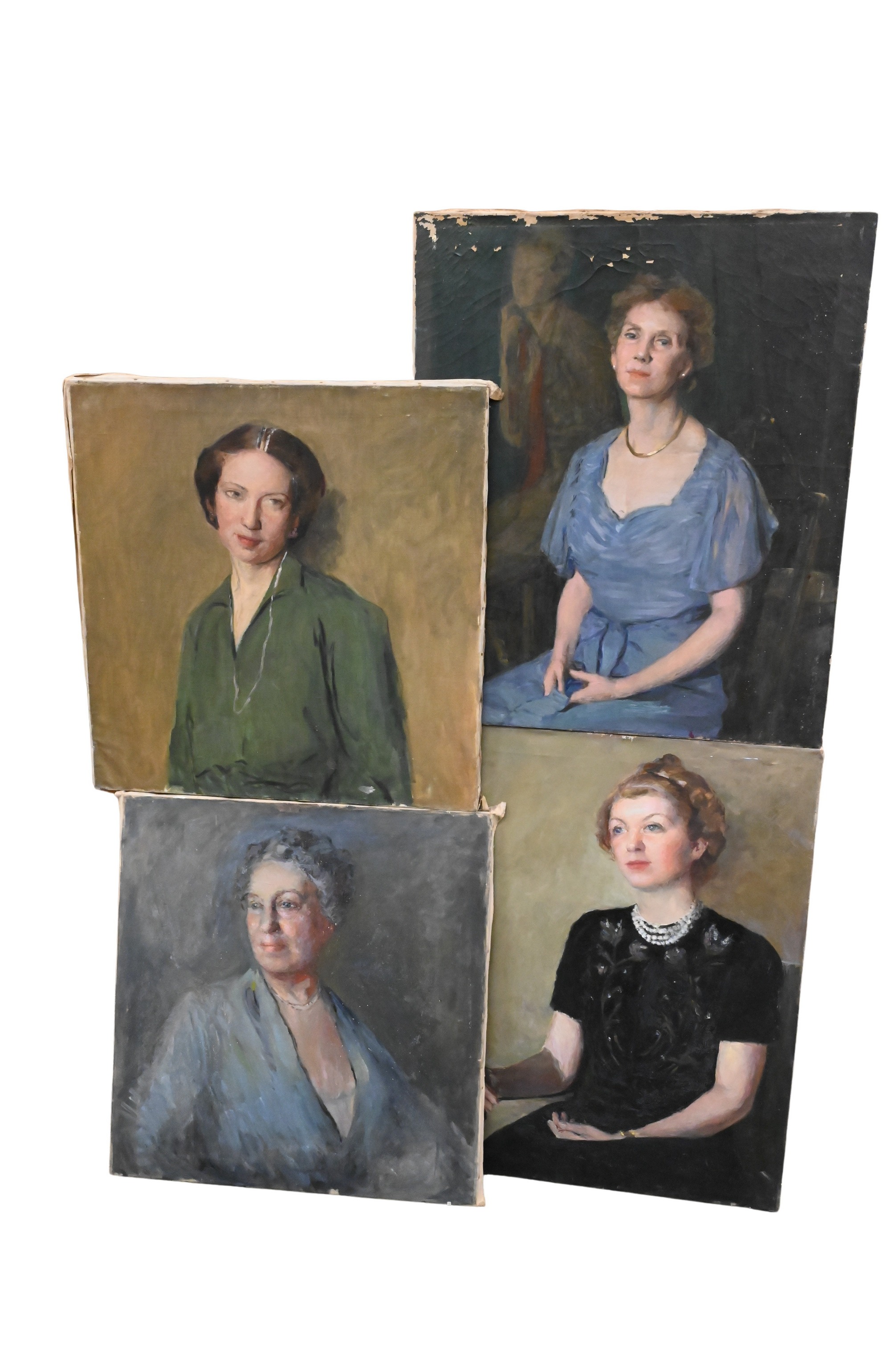 to include a portrait of a lady in a blue dress and gold necklace seated in a studio, a young lady with a pearl necklace, a woman in a green dress along with a portrait of an older woman possibly Florence Griswold