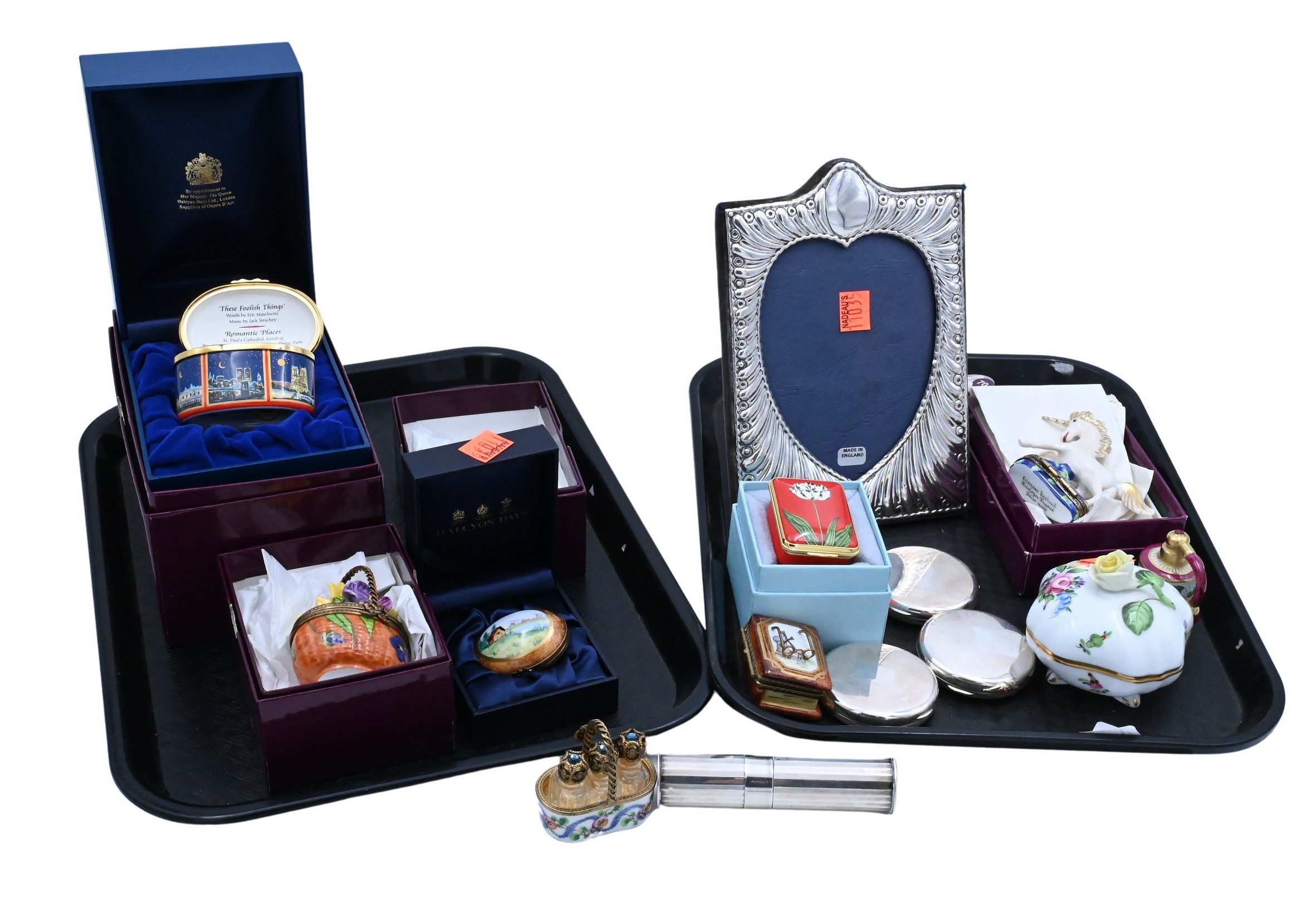 nine porcelain and enamel trinket boxes, one Herend, Limoges unicorn, atomizer, basket of flowers, miniature caddy with three jeweled glass perfume bottles, book and glasses pill box, oval box with cabin motif, along with Halcyon Days “These Foolish Things-Romantic Places” edition 62/750 music box, and “Tulipa-The Rodney” box, along with Reed and Barton 1993 sterling Christmas Cross, Kirk Stieff, sterling picture frame etc…
