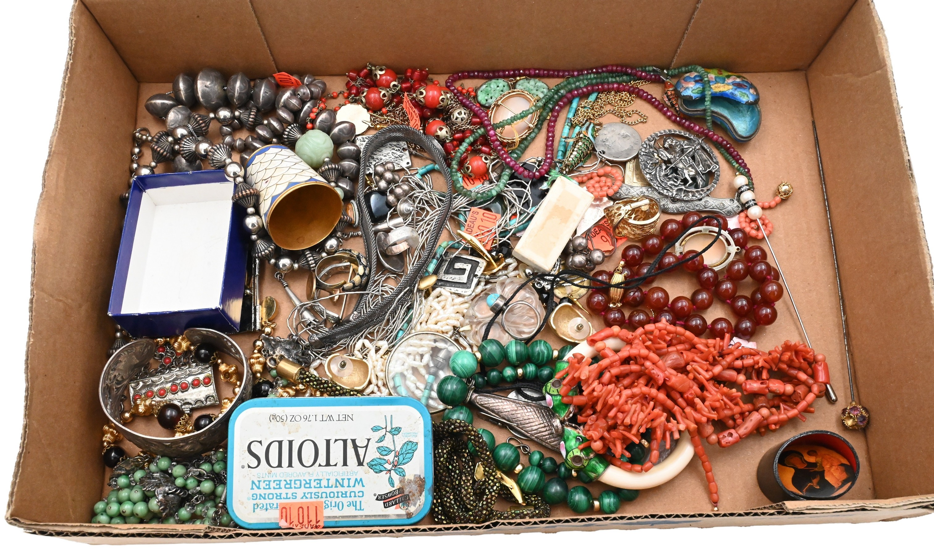 to include Native American silver, Victorian carol, and bend necklaces, earrings, articulated enamel fish, stone beads, etc., coral lapis, harstone and enamel pieces
