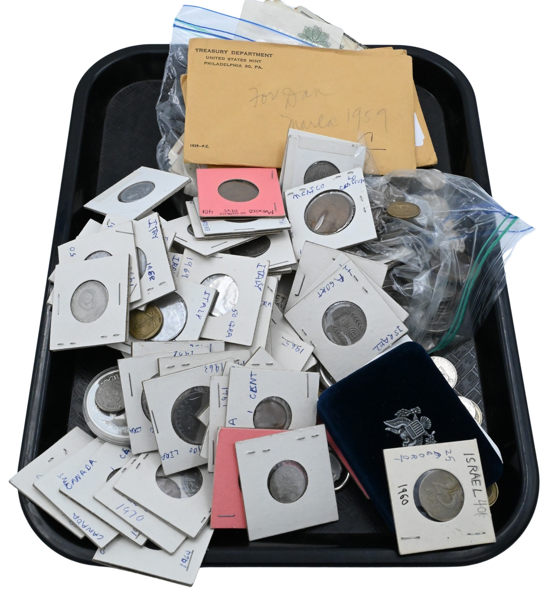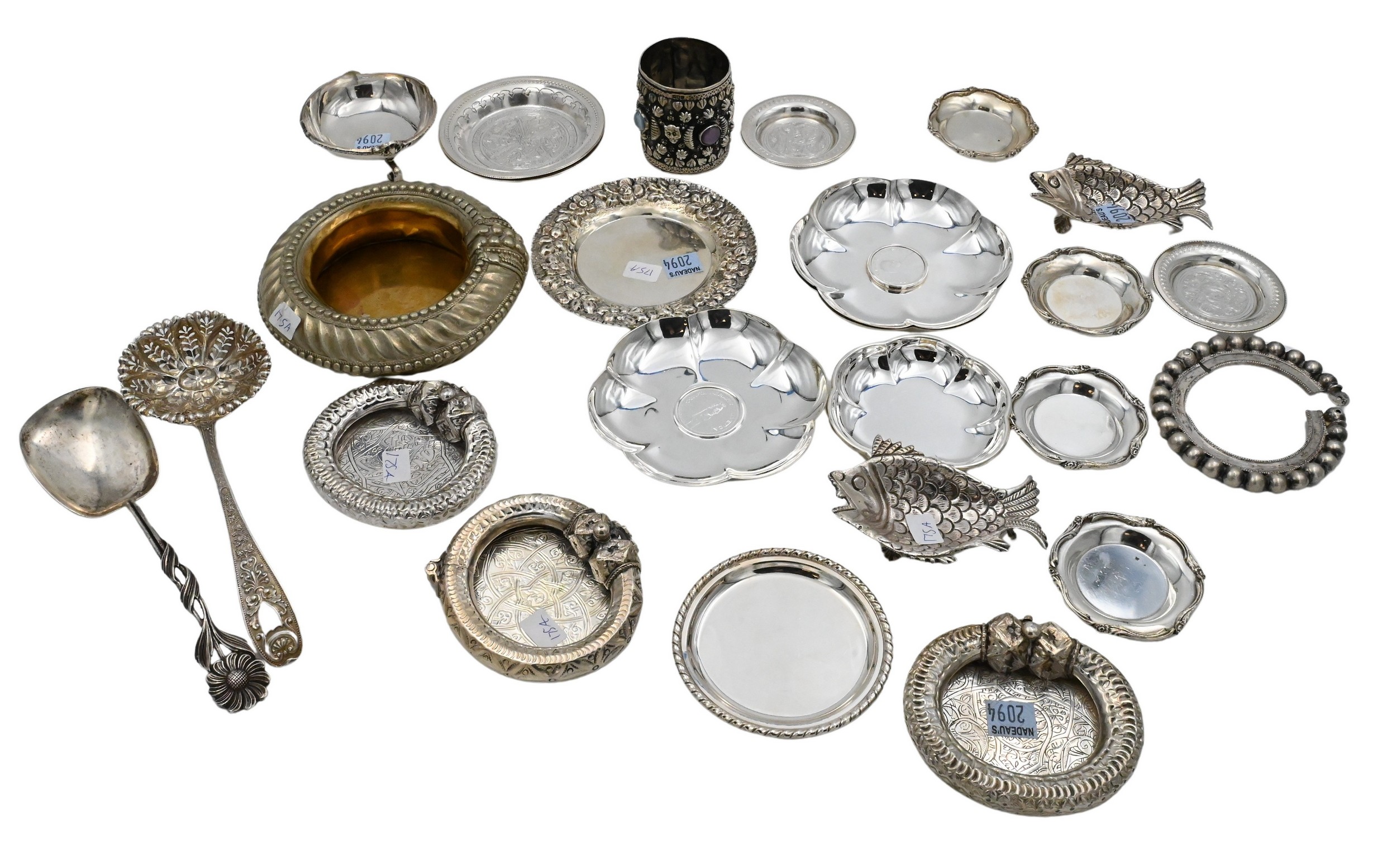 to include small trays some with coins and two in form fish, weighted bangles made into small dishes, one with stones, etc…