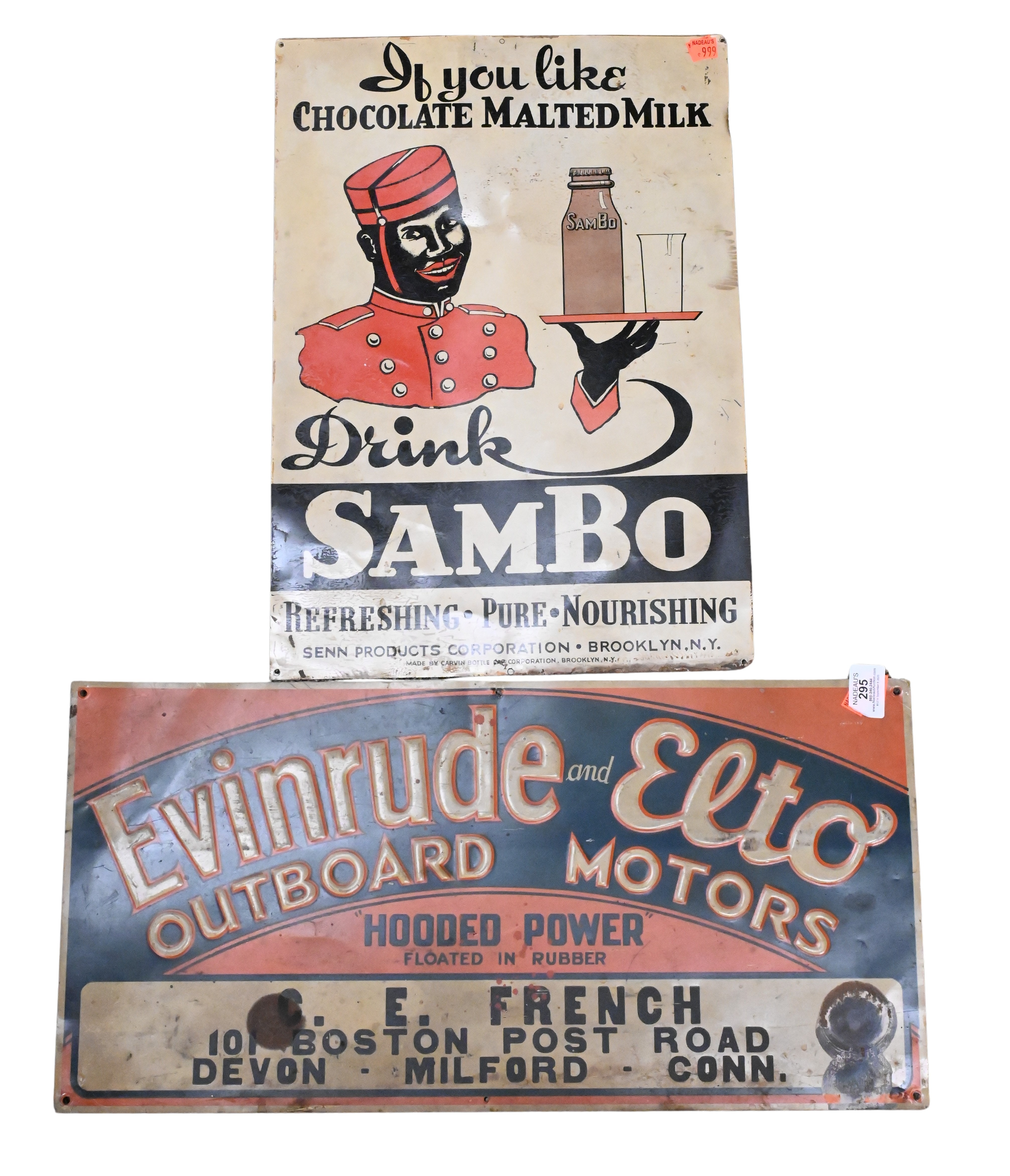 Evinrude and Elto Outboard Motors sign with raised letters and Sambo Chocolate Malted Milk sign