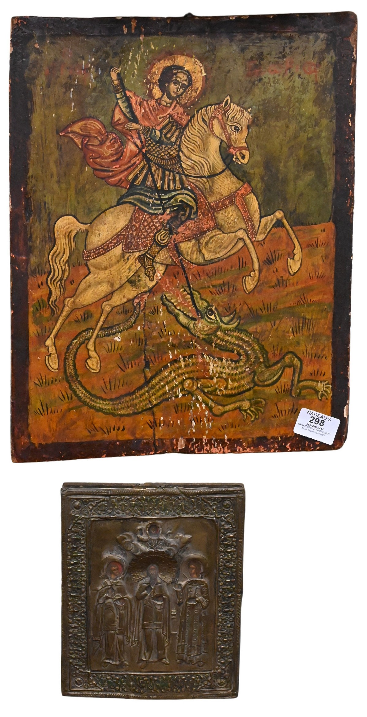 Egg tempera on wood board depicting the saint on a white horse piercing a green dragon with his spear