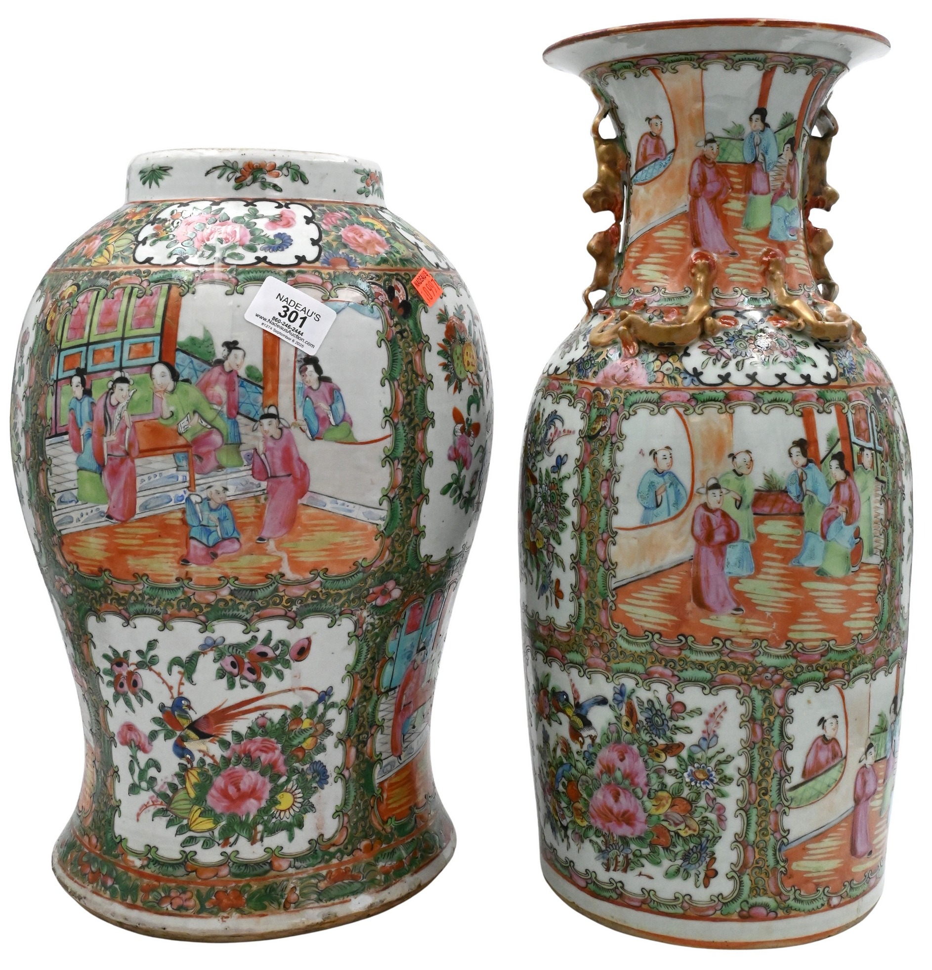 to include tall rose medallion dragon and gilt foo dog handle vases of baluster form along with baluster form temple jar
