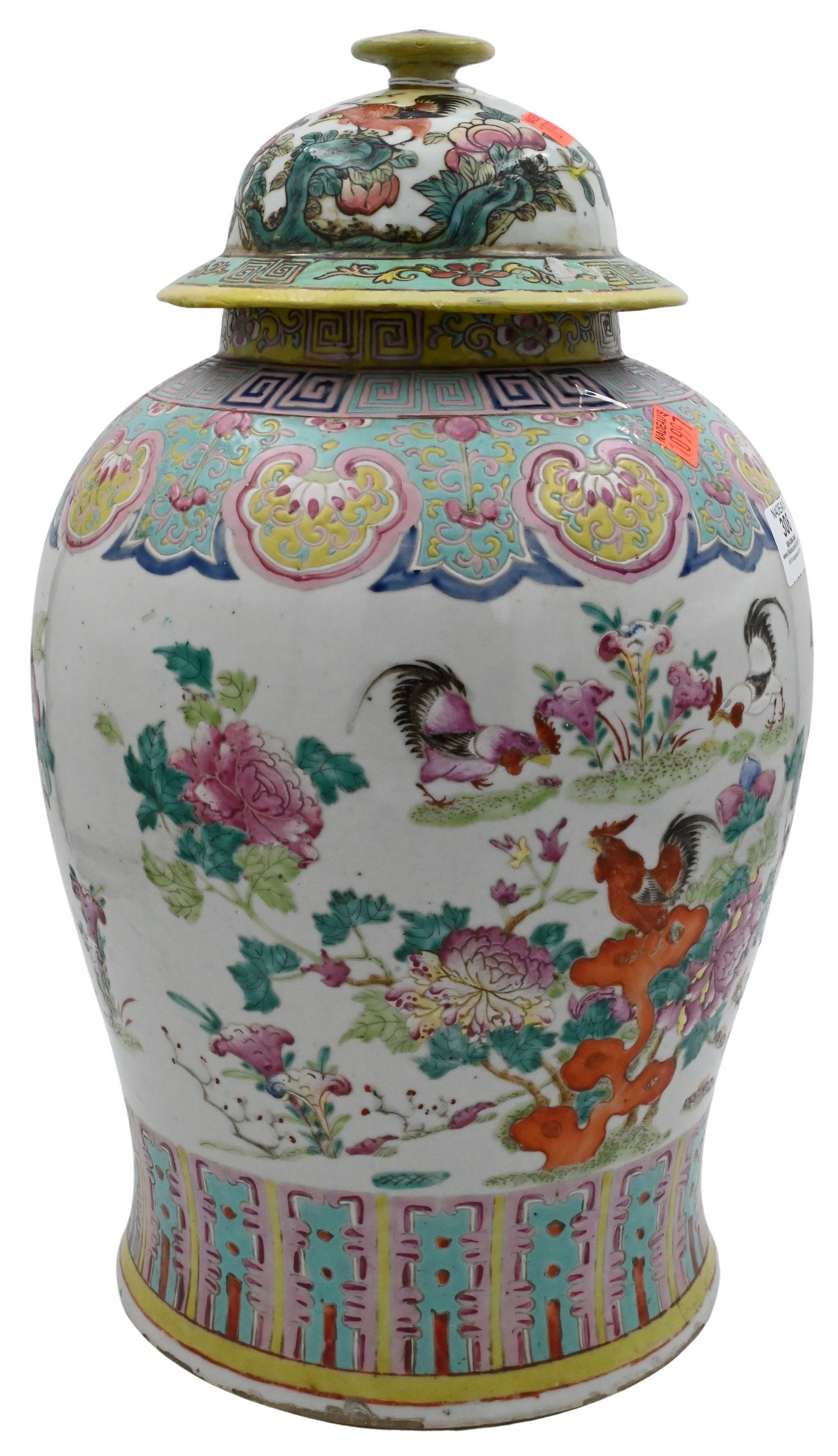 lidded ginger jar featuring enameled chickens in a landscape with cherry blossoms