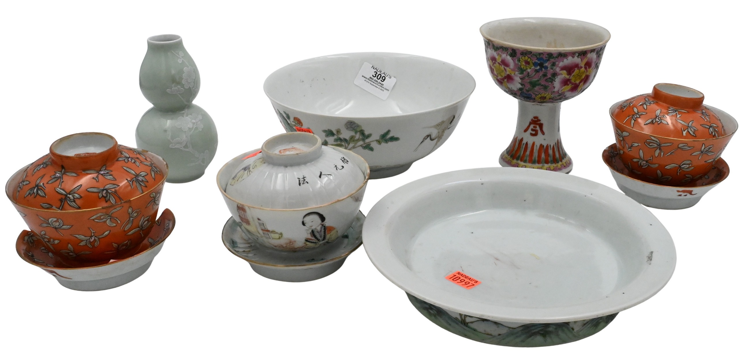 celadon double gourd vase, pair of orange teacups with stand and lid, famille rose pedestal cup, crane and waves bowl etc…