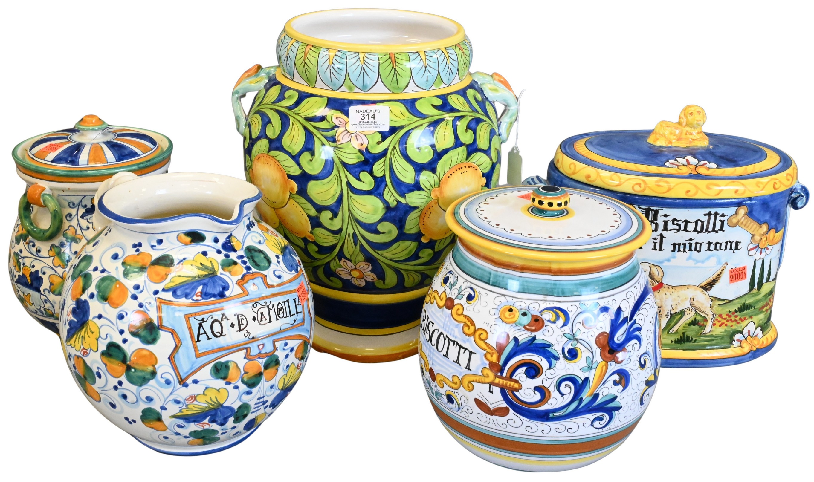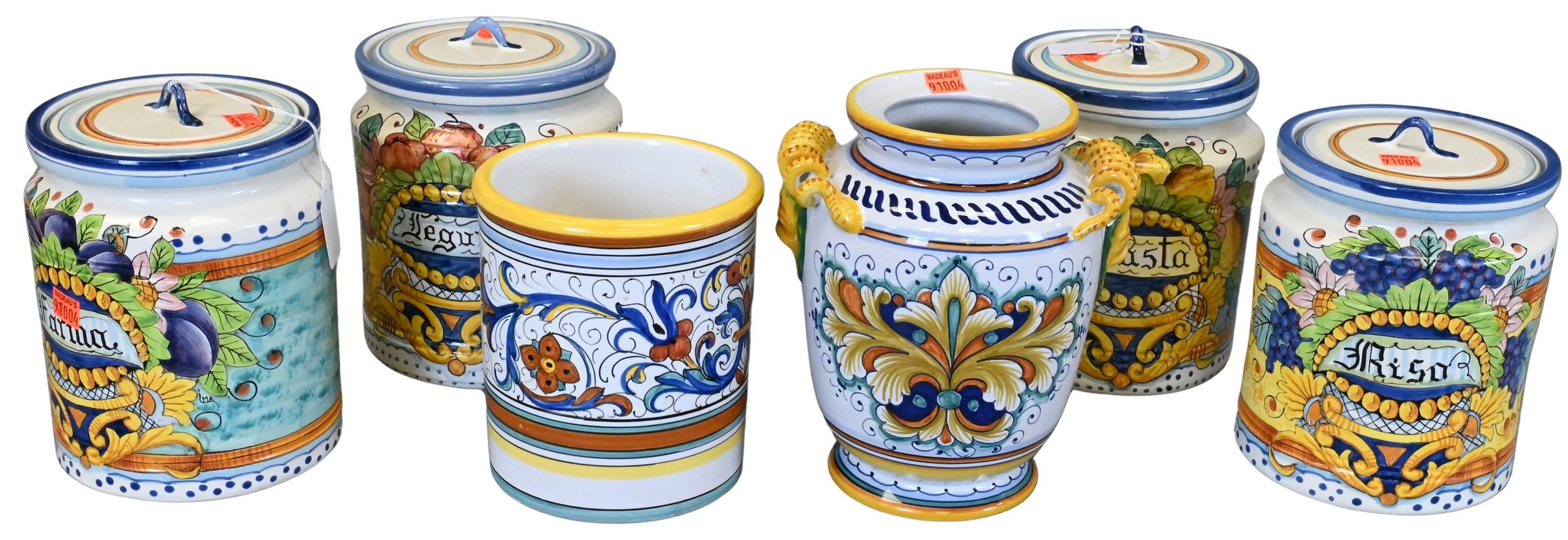 set of four lidded canisters having food labels “Pasta”, “Legumi”, “Farina”, “Riso”, biscotti jar, along with a vase with scrolling snake handles etc…