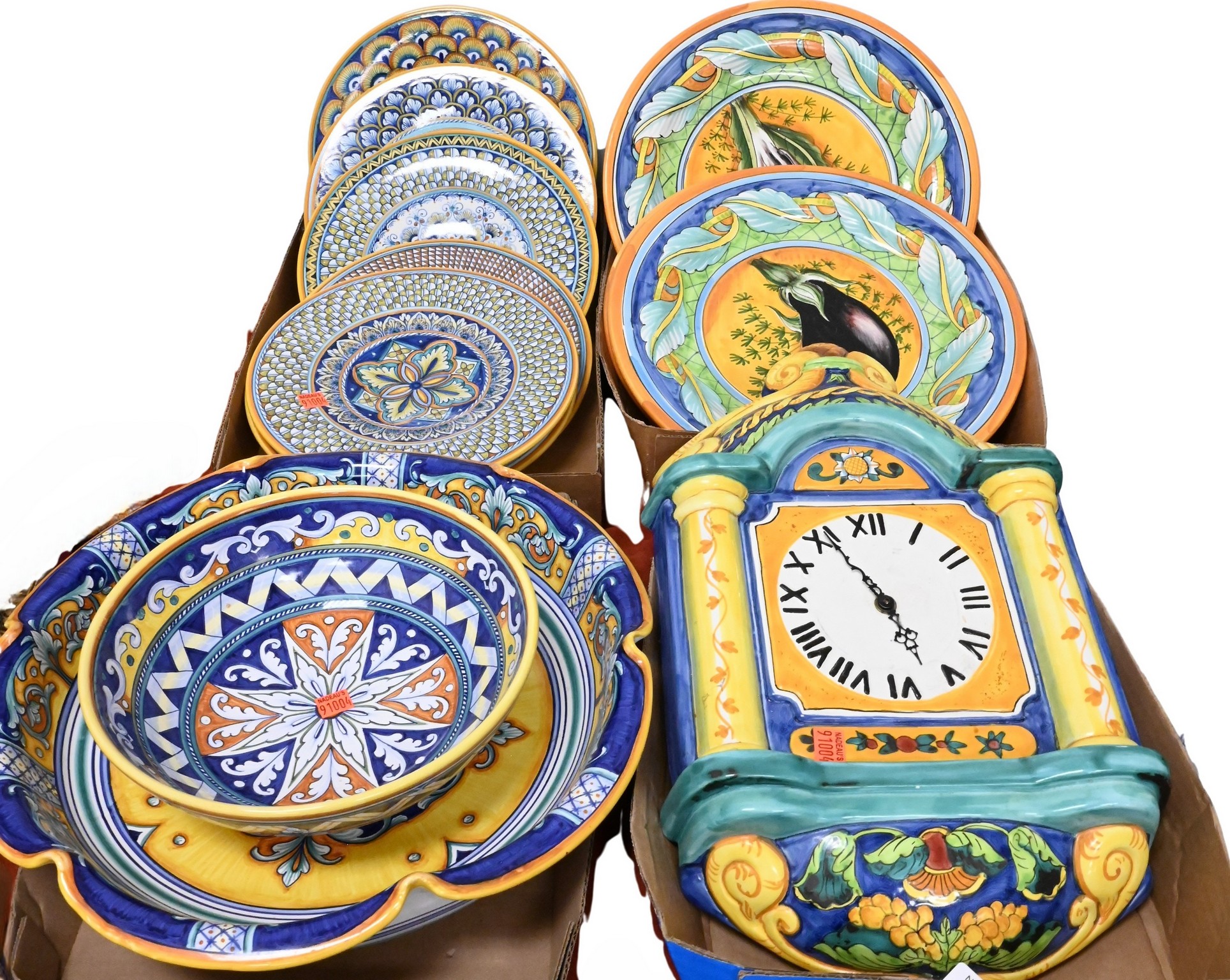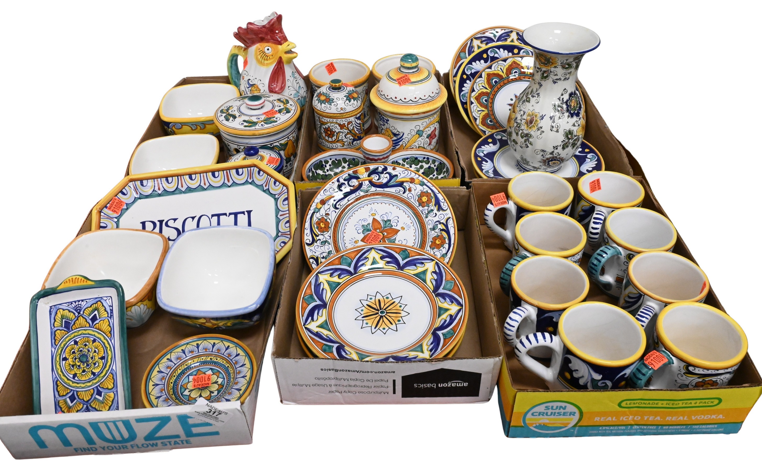 eight Vietri Italy bread and butter plates, eight Vietri mugs, rooster pitcher, butter tray, square bowls, small canisters etc…