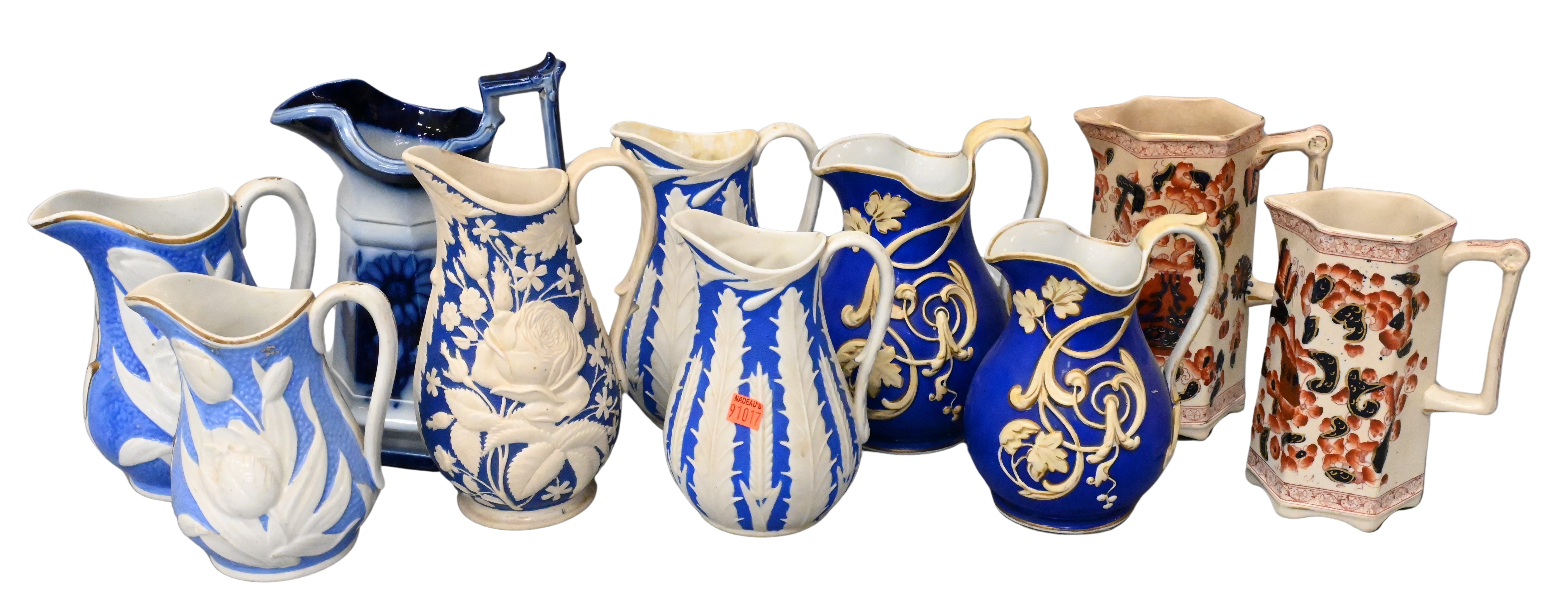 two blue and white wheat motif pitchers, two white and blue with tulip motif,one French rose pitcher, ironstone wash pitcher transferware by T.Walker, two labeled Staffordshire with high relief vines, along with two Imari style ewers