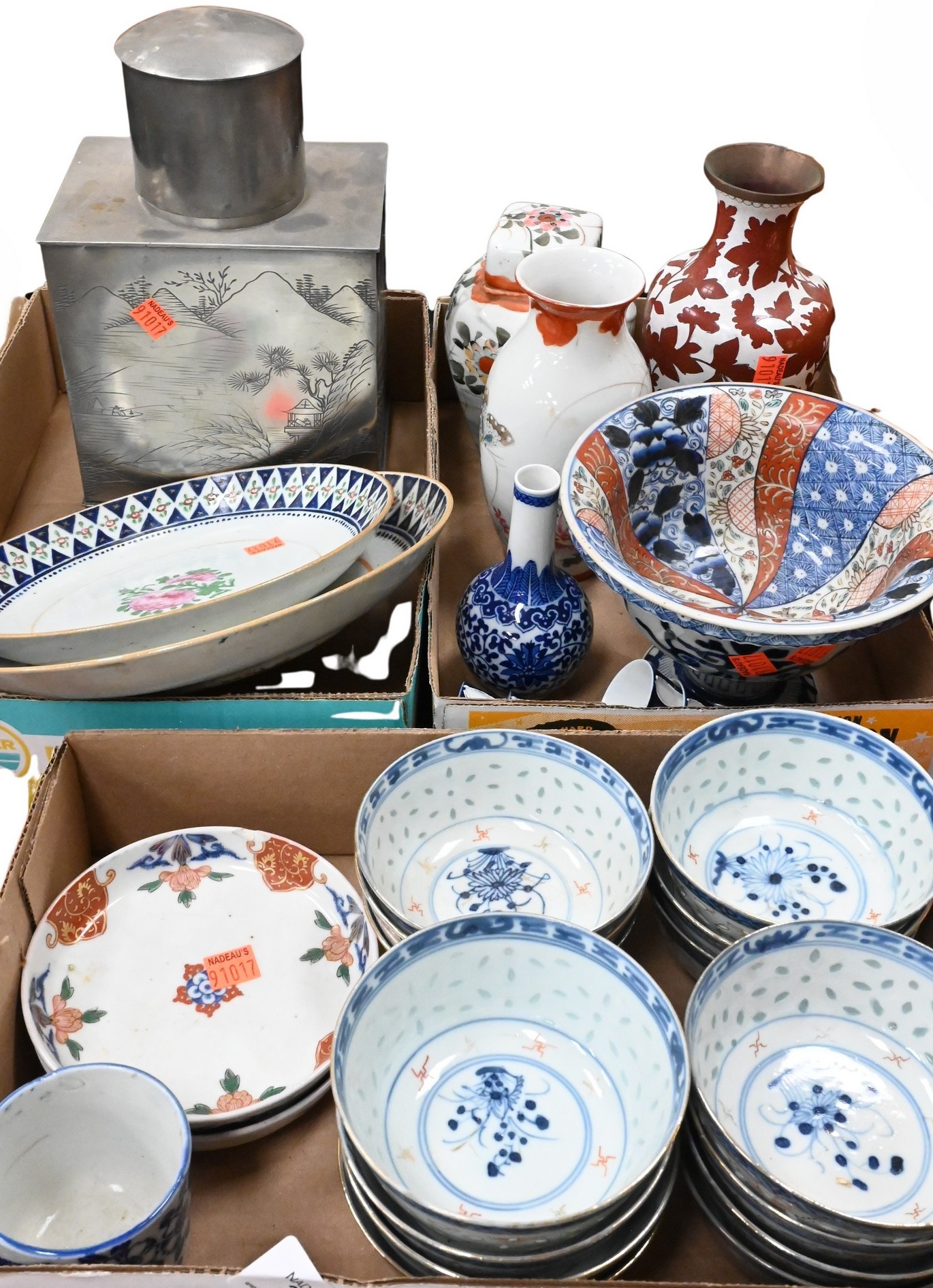 two 18th century Chinese export plates, large pewter tea caddy with character marks to underside, pair of carved and polychrome figures riding geese, small cinnabar box, red and white cloisonne vase, Japanese Imari haisen/pedestal bowl