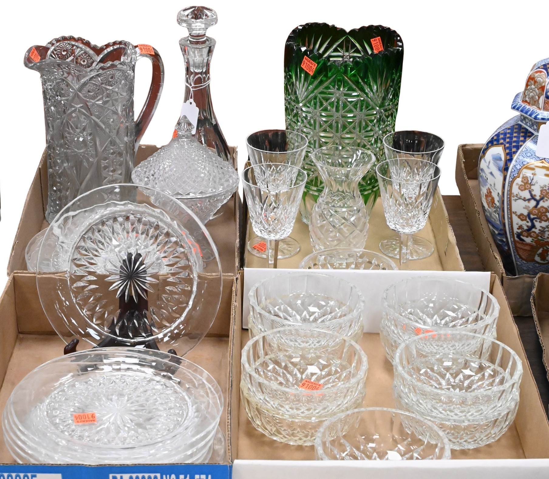 Twelve Val St. Lambert “Imperial” salad plates and ten berry bowls, four Waterford stems and one small vase, cut glass pitcher, decanter, green cut to clear vase etc…