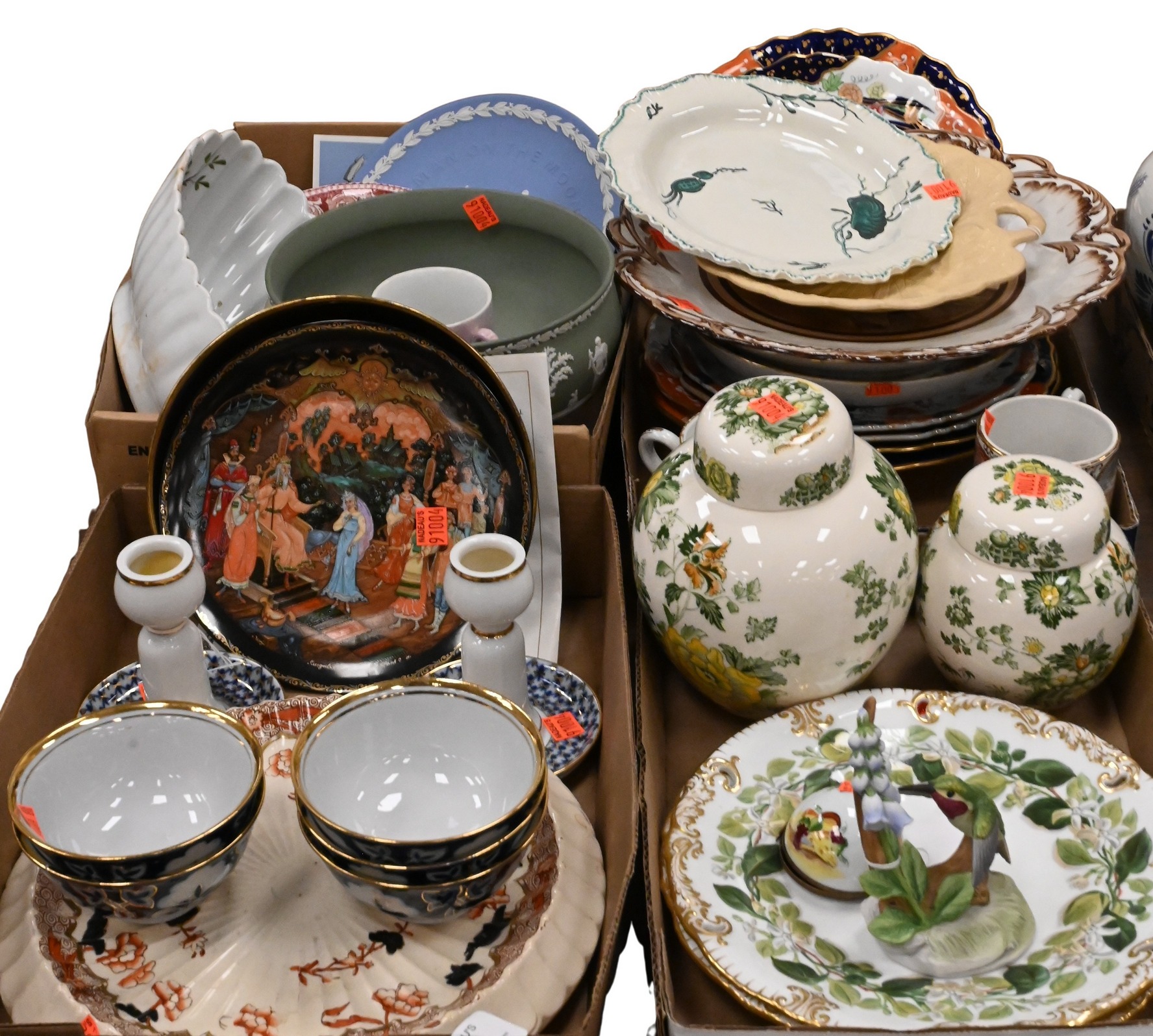 Empire Works Stoke on Trent platter of “Ruben’s” (diameter 13 inches) five Russian bowls, two Imperial Russian candlesticks, green Wedgewood cameo compote, Limoges trinket box with cheese platter, Coalport/Spode Imari plates etc…