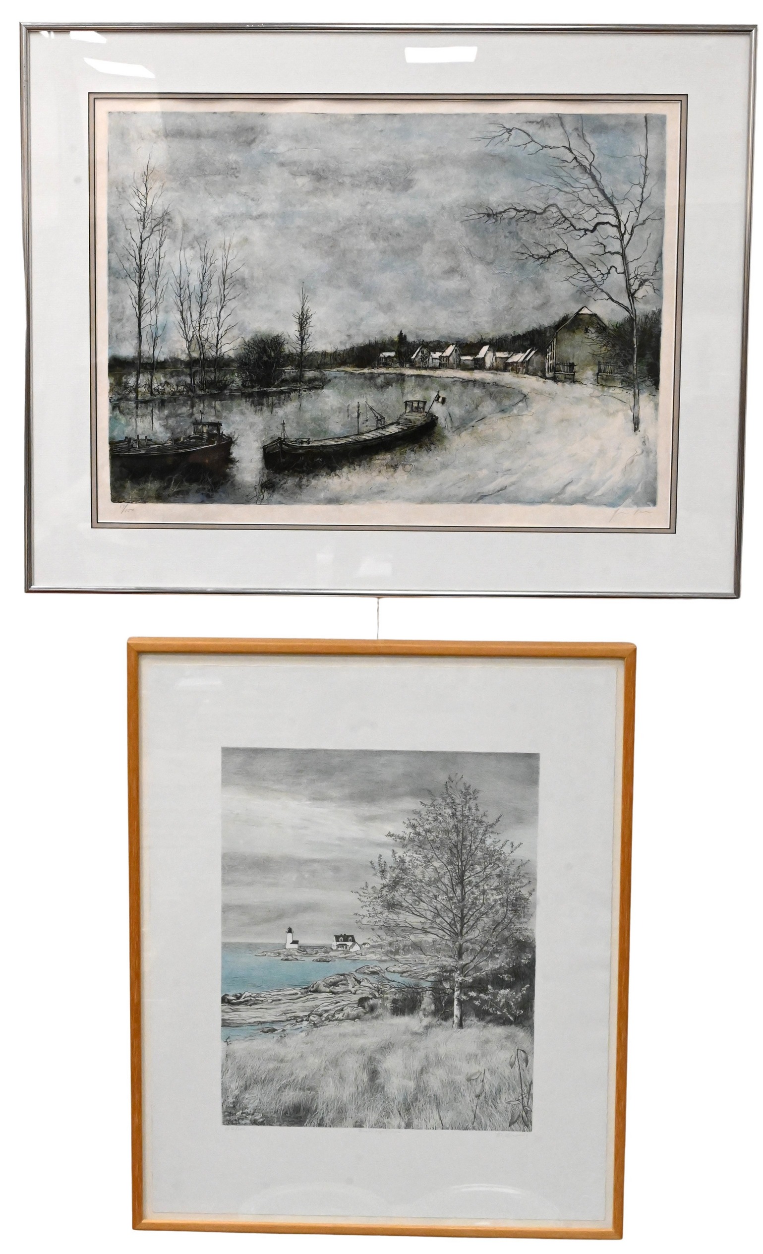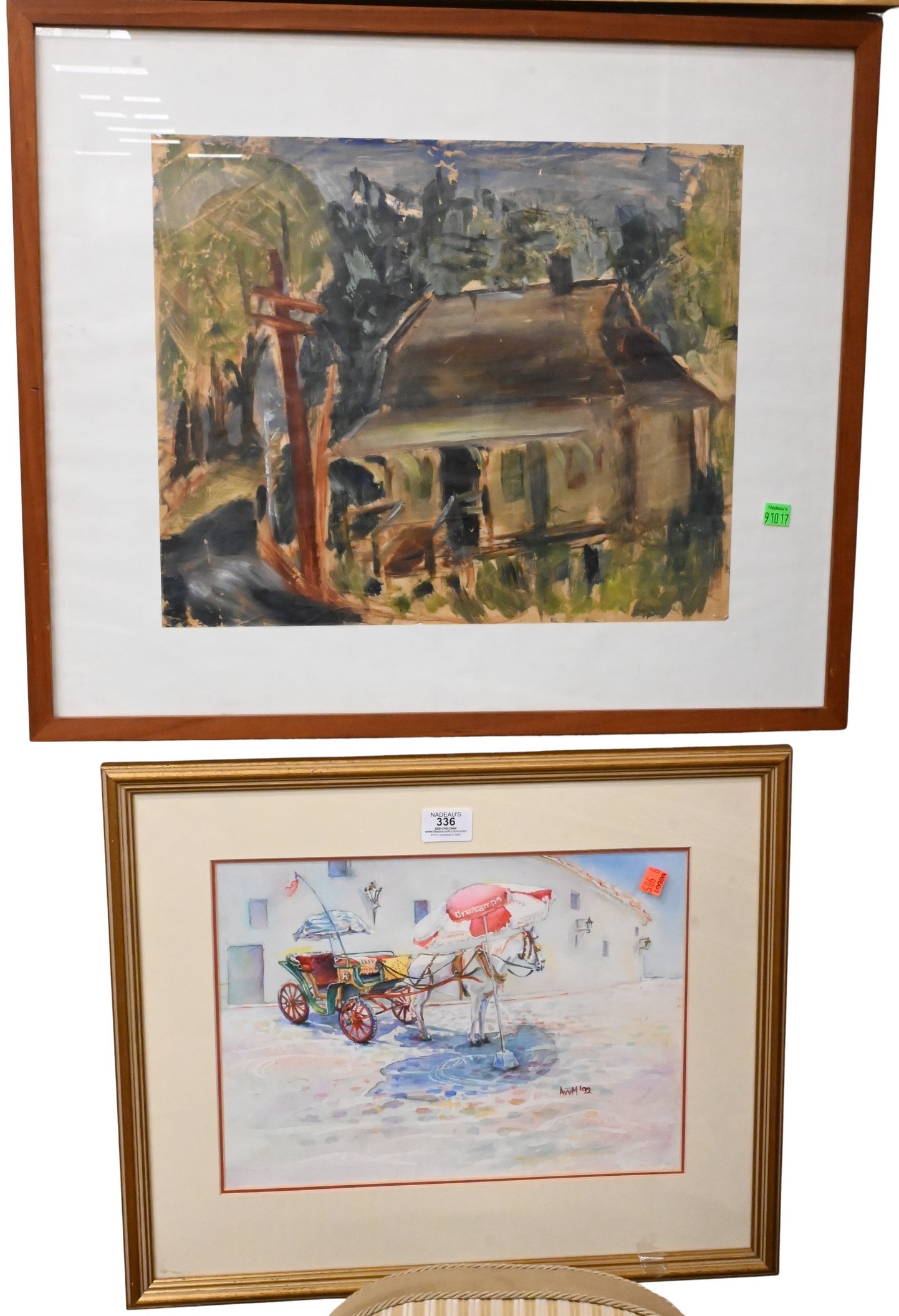 along with three unsigned acrylic on paper landscapes with houses and trees