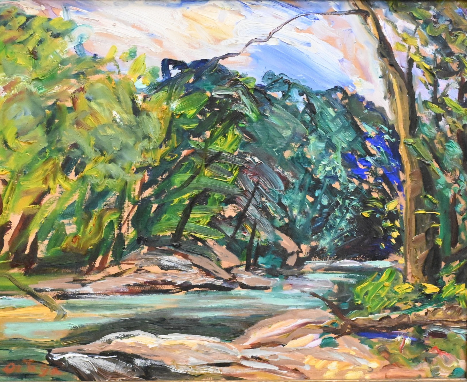 along with small oil on canvas of birch trees on a path, signed in cirillic, one house signed Isles, three illegibly signed landscapes one a house and stream, one harbor scene and the other with people picnicking under trees etc