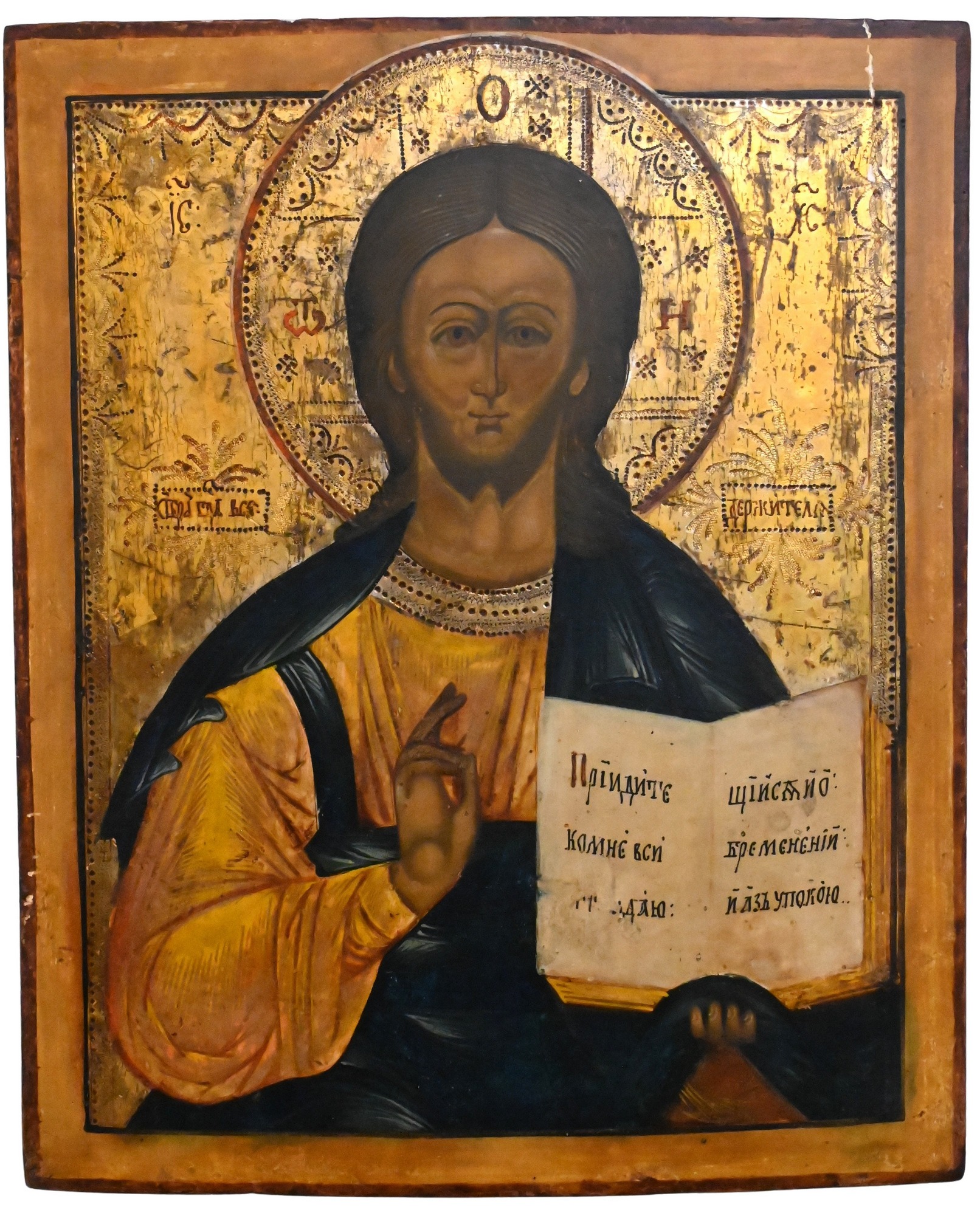 “Jesus Christ Pantocrator” featuring Christ raising one hand in a blessing while the other holds an open book