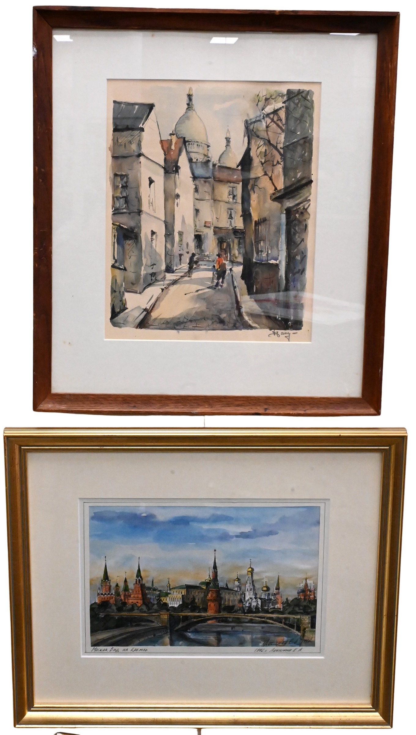 Three Parisian, French style cityscape street scenes, signed illegibly, Cityscape of the Kremlin, Russia, 1992, signed in cyrillic, Coastal scene in Capris Italy, watercolor and gouache