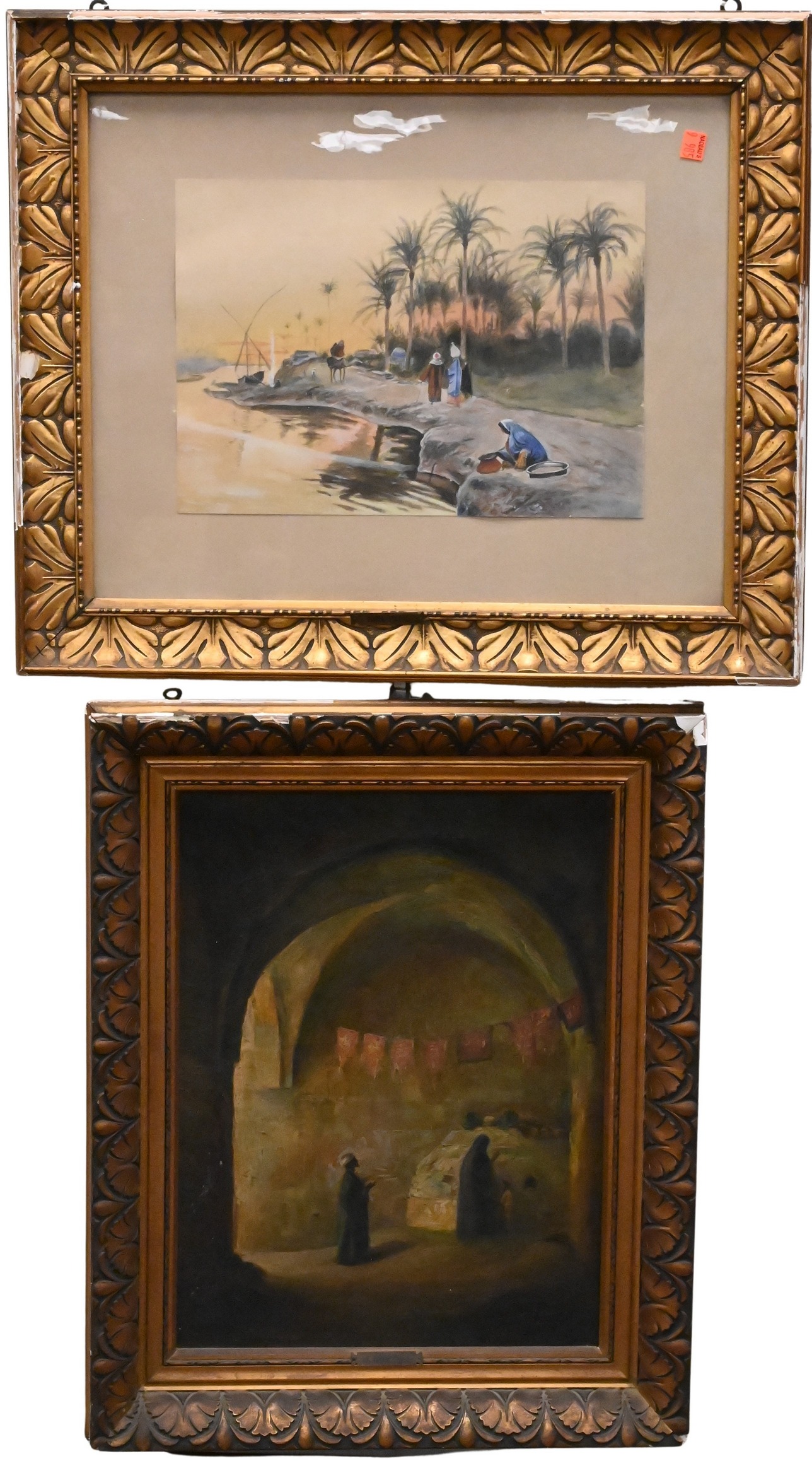 along an unsigned watercolor and gouache of veiled women gathering water from the Nile River