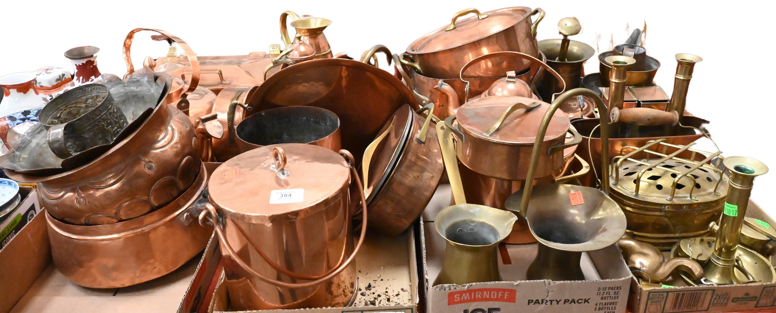 French copper pots, kettles, platters, tea caddy, along with Turkish coffee pot or chocolate pot, brass candlestick holders, mortar and pestle, hand hammered Islamic/Persian ewer, large bucket etc…