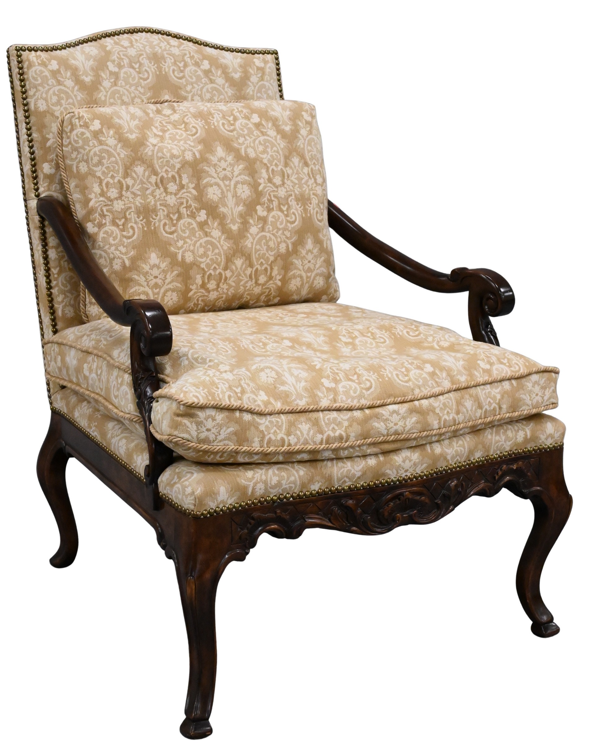 with down cushion and Georges Bordeaux Fauteuil upholstery in like new condition