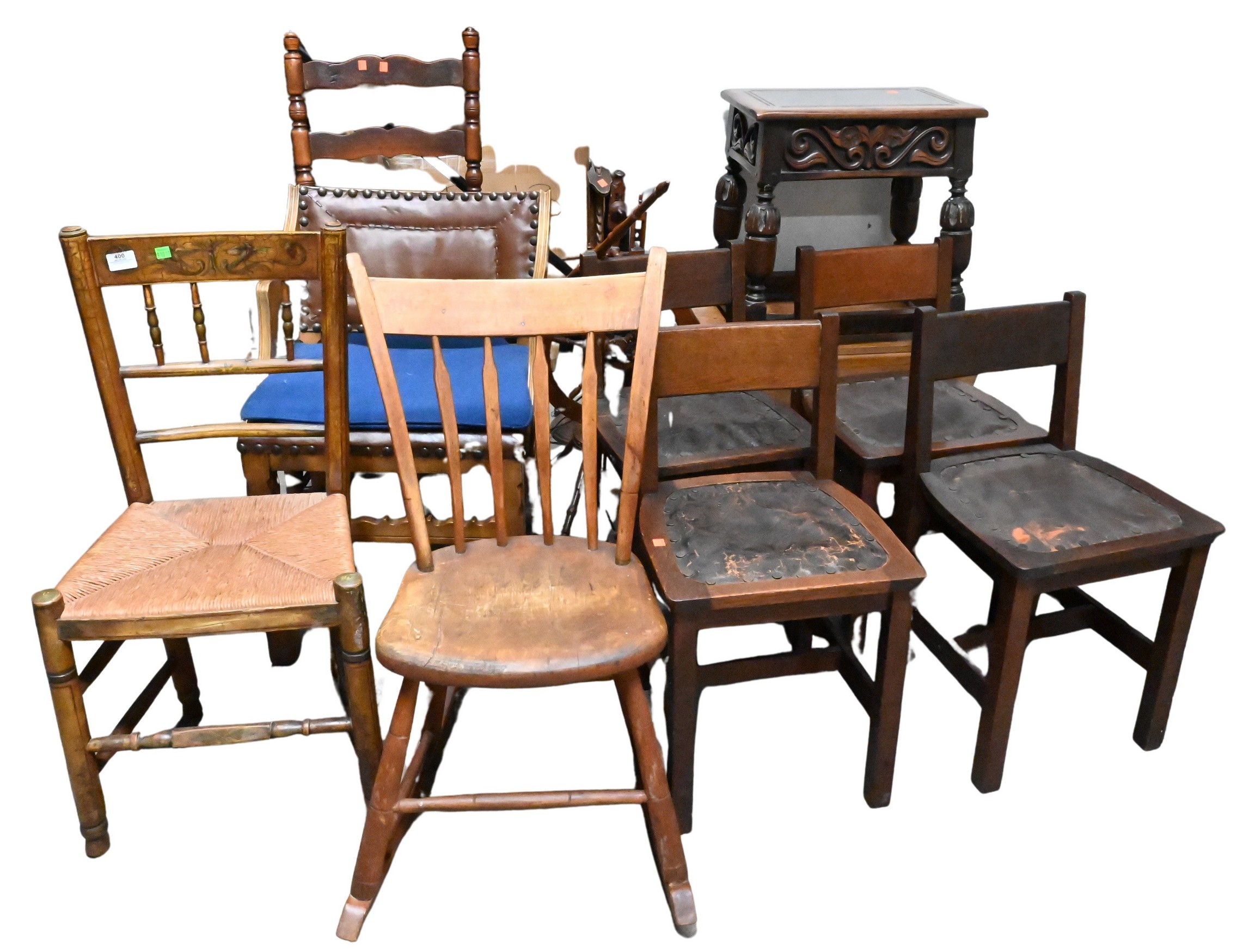 to include a ladder back rocker, two small tables, three chairs, a candlejack style floor lamp, a spinning wheel, and four small oak chairs