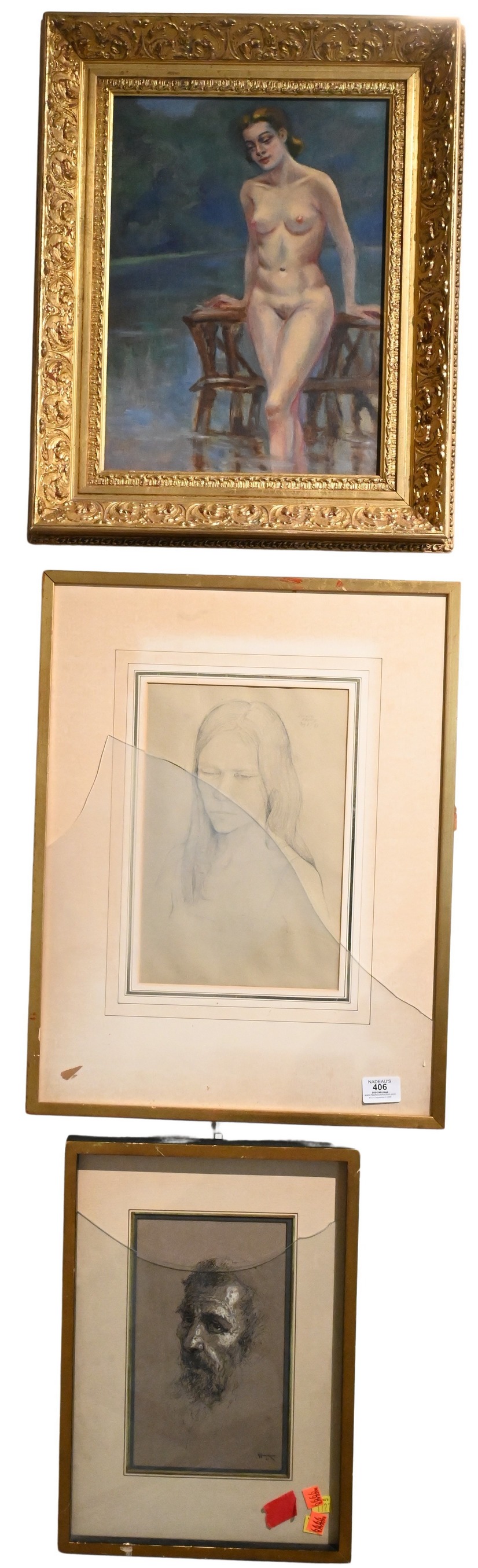 along with an oil on canvas of a female nude in a river and a pencil portrait of a girl signed Locker, Madrid ’61