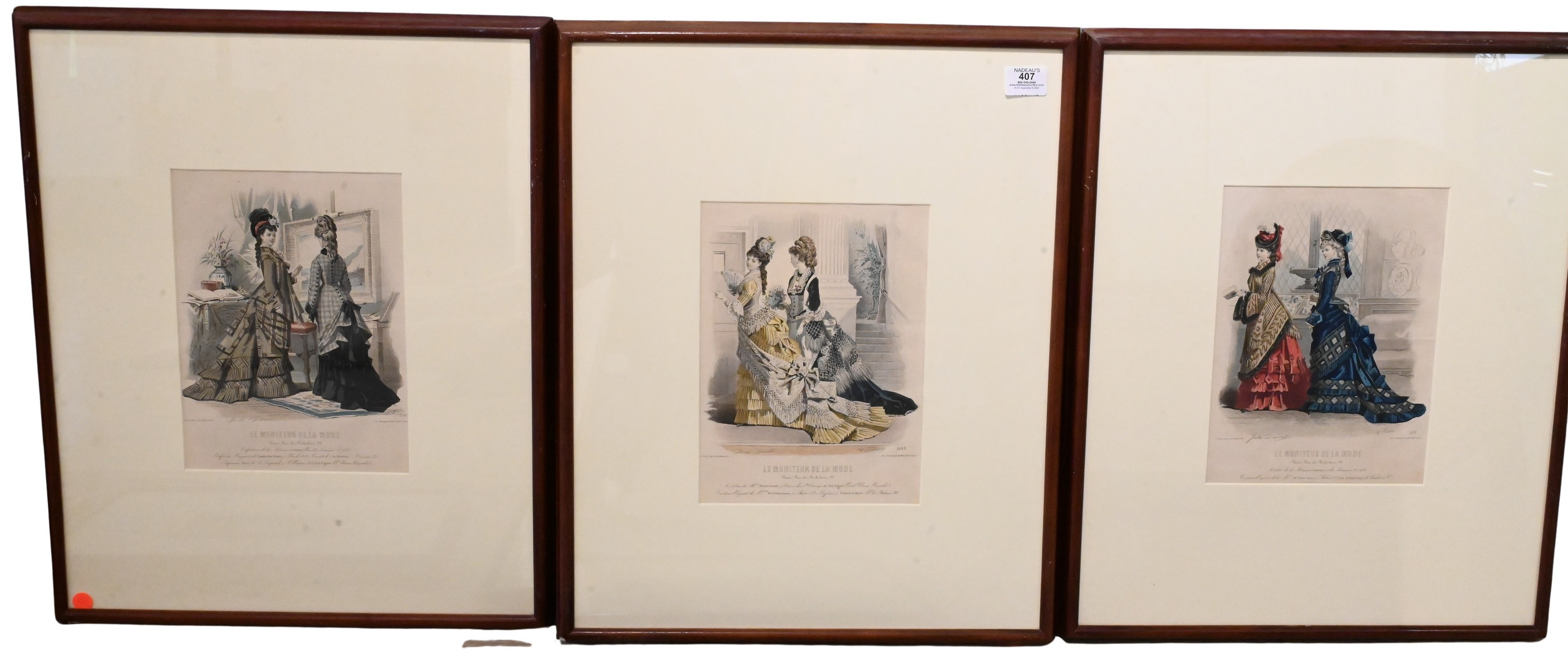 four Le Moniteur de la Mode 19th century women’s fashion magazine bookplates, after Augustus Kollner “Wall Street N.Y. 1847” Lithograph, “Boston and Bunker Hill”, Portrait of Madison, “Aquatic Temple”