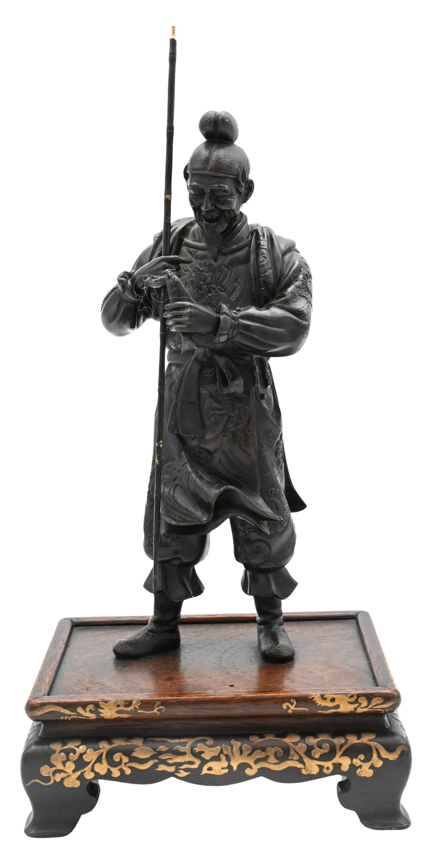 Finely cast and detailed standing figure of a fisherman or attendant, dressed in elaborately patterned robes with dragon and cloud motifs, holding a staff, his hair drawn up in a topknot. Incised with a rectangular signature cartouche reading Miyao, for the Miyao Company, Raised on a custom wood stand with gilt scrollwork. Meiji period