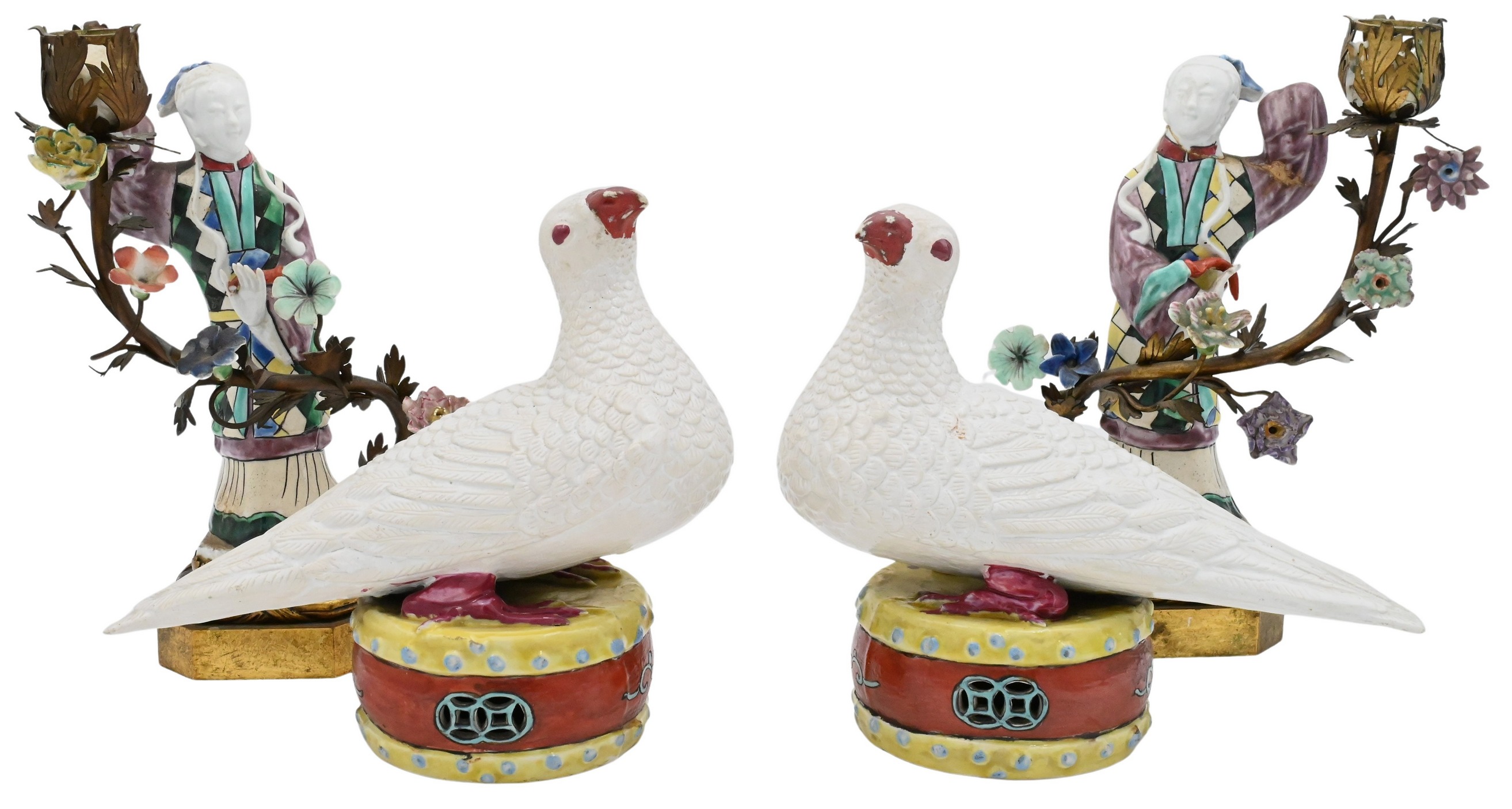 Comprising a pair of export porcelain figures in colorful robes, each surmounted by gilt-bronze branches issuing enameled flowers and foliate candle sockets, raised on conforming giltwood hexagonal bases, together with a pair of porcelain doves, with white feathered bodies and red crests, perched upon brightly enameled drum-form bases decorated in famille rose enamels with scrolling designs and gilt accents.
