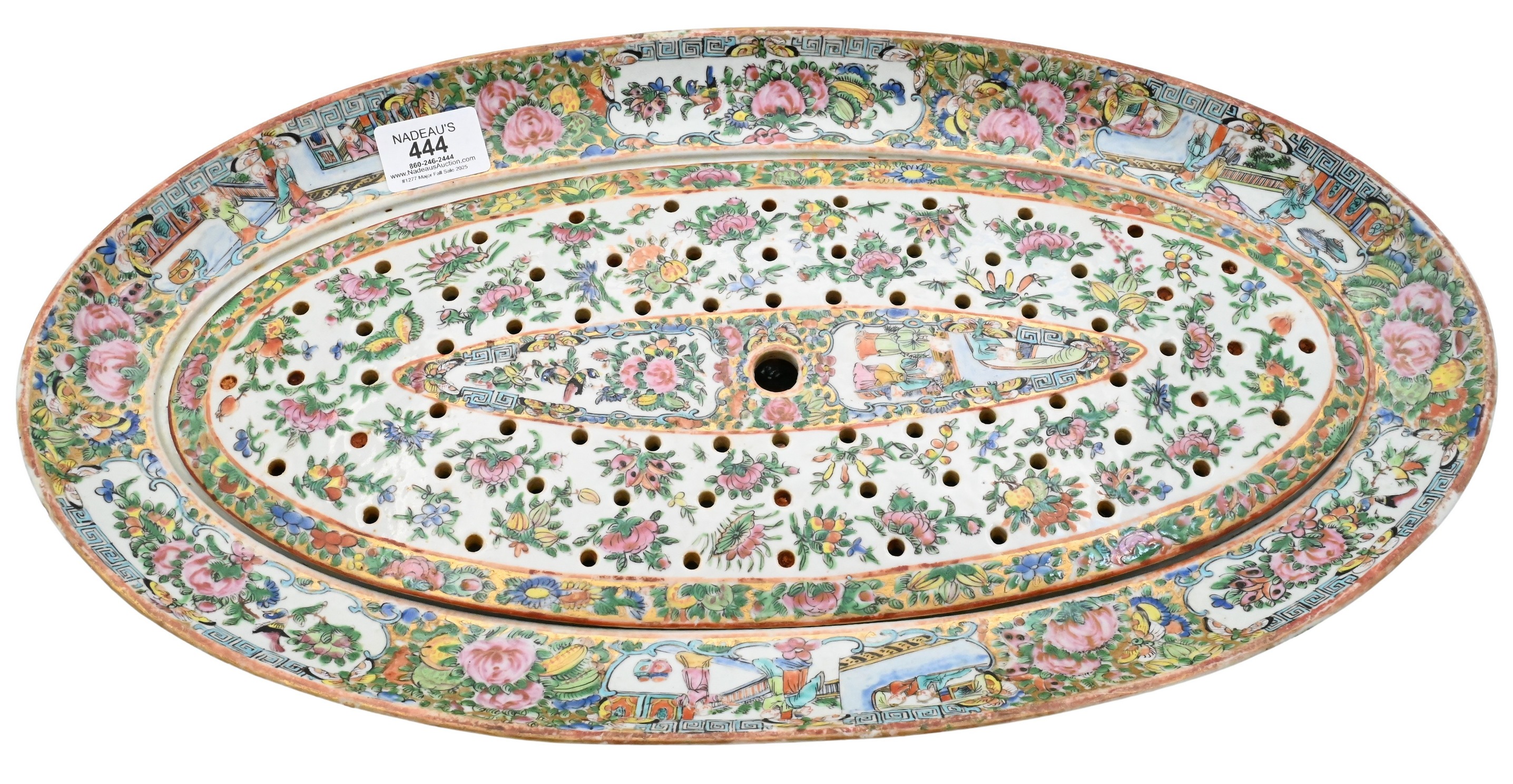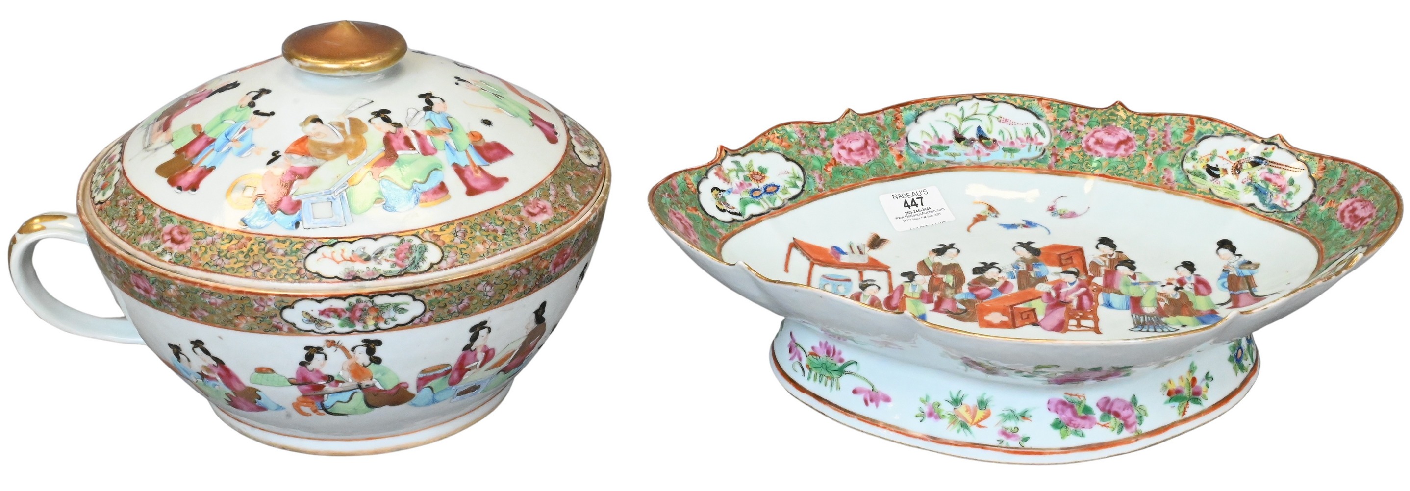 Comprising a large covered chamber pot with gilt knop and handle, along with oval shaped compote, each decorated in famille rose enamels with alternating figural and floral panels within gilt foliate borders