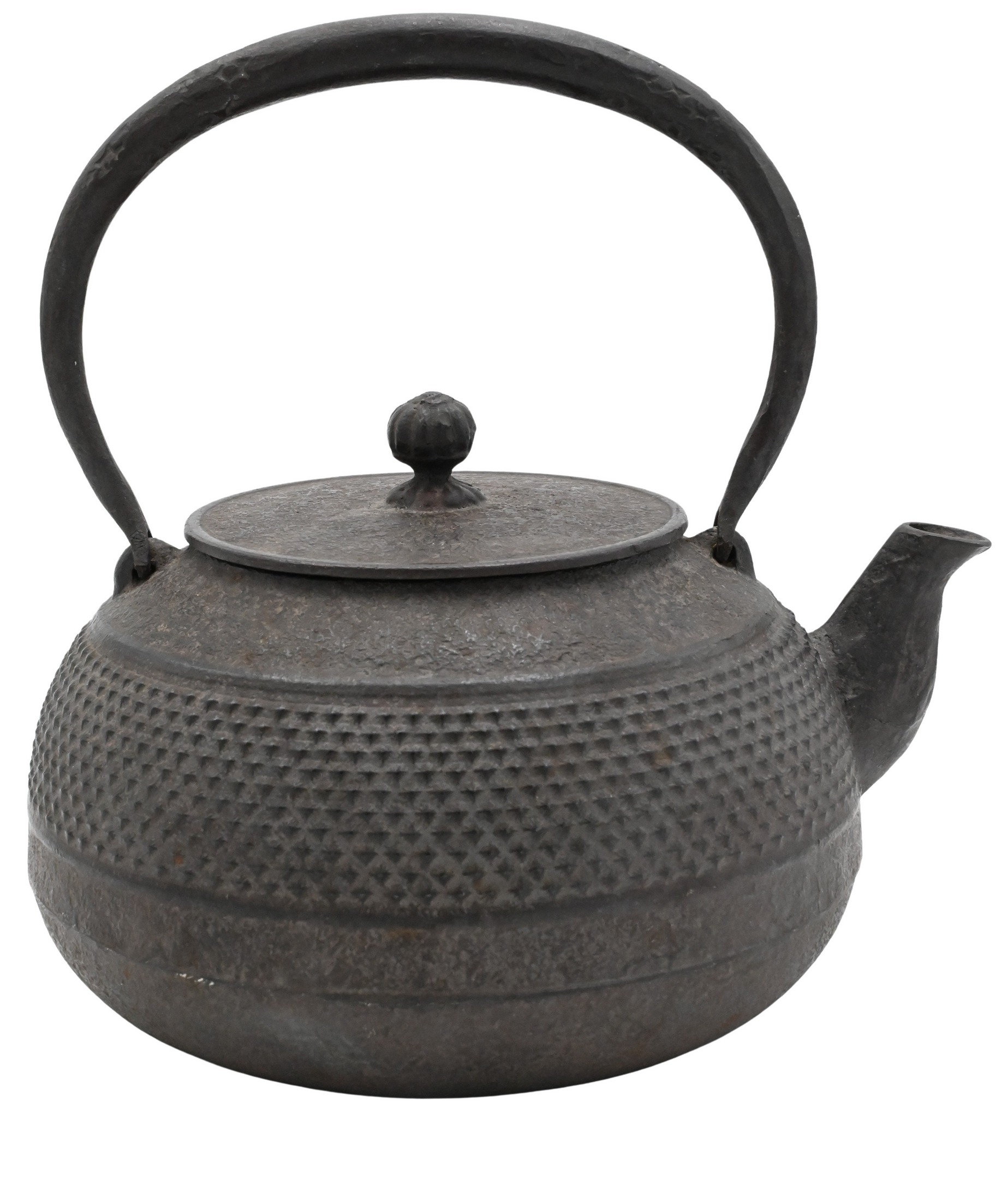 A Japanese cast-iron tetsubin teapot with textured hobnail pattern to the body, arched swing handle, and straight spout. Retains original fitted lid.