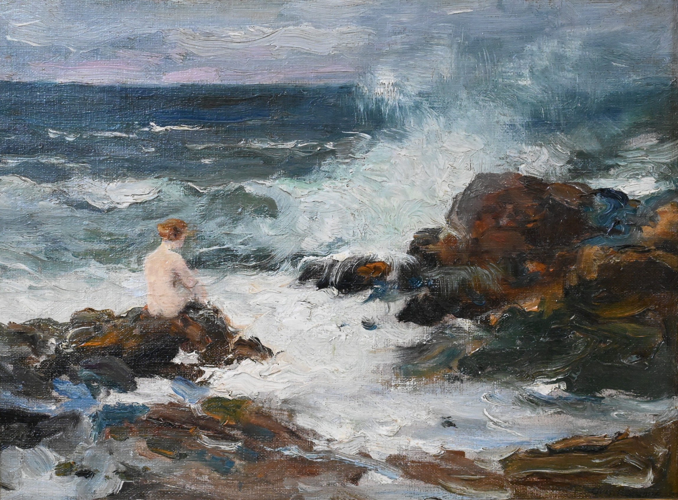 dramatic coastal scene with waves crashing against rugged rocks. In the foreground, a partially draped figure with reddish hair sits on the shoreline, gazing toward the turbulent surf. The composition is painted with vigorous, expressive brushstrokes and a rich impasto technique
