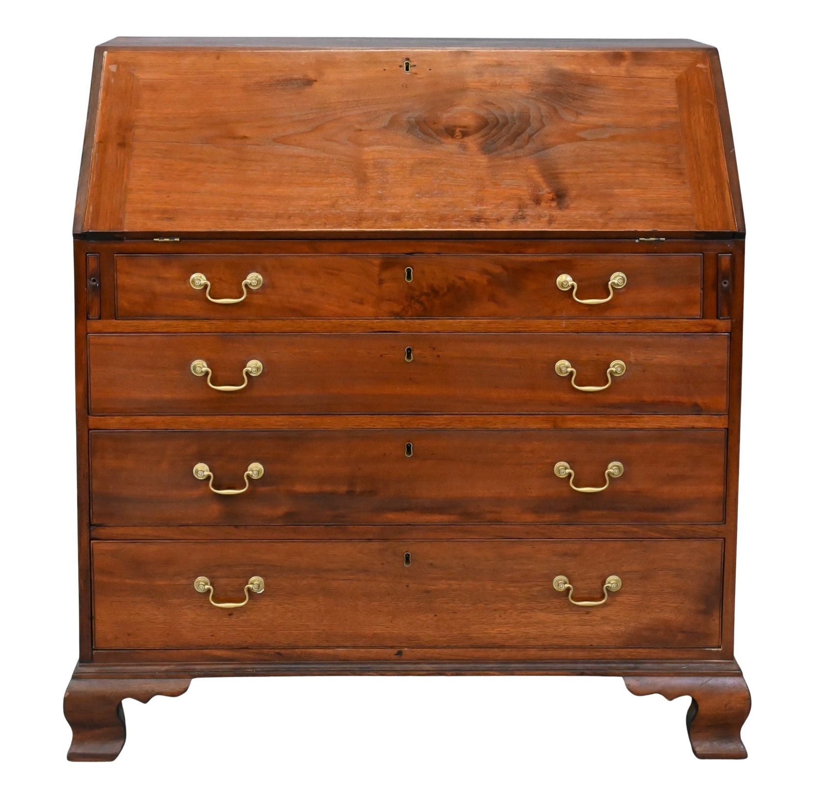 The hinged slant lid opening to an interior fitted with drawers and compartments, over four graduated long drawers with brass bail pulls, raised on ogee bracket feet. Constructed in walnut with figured grainches