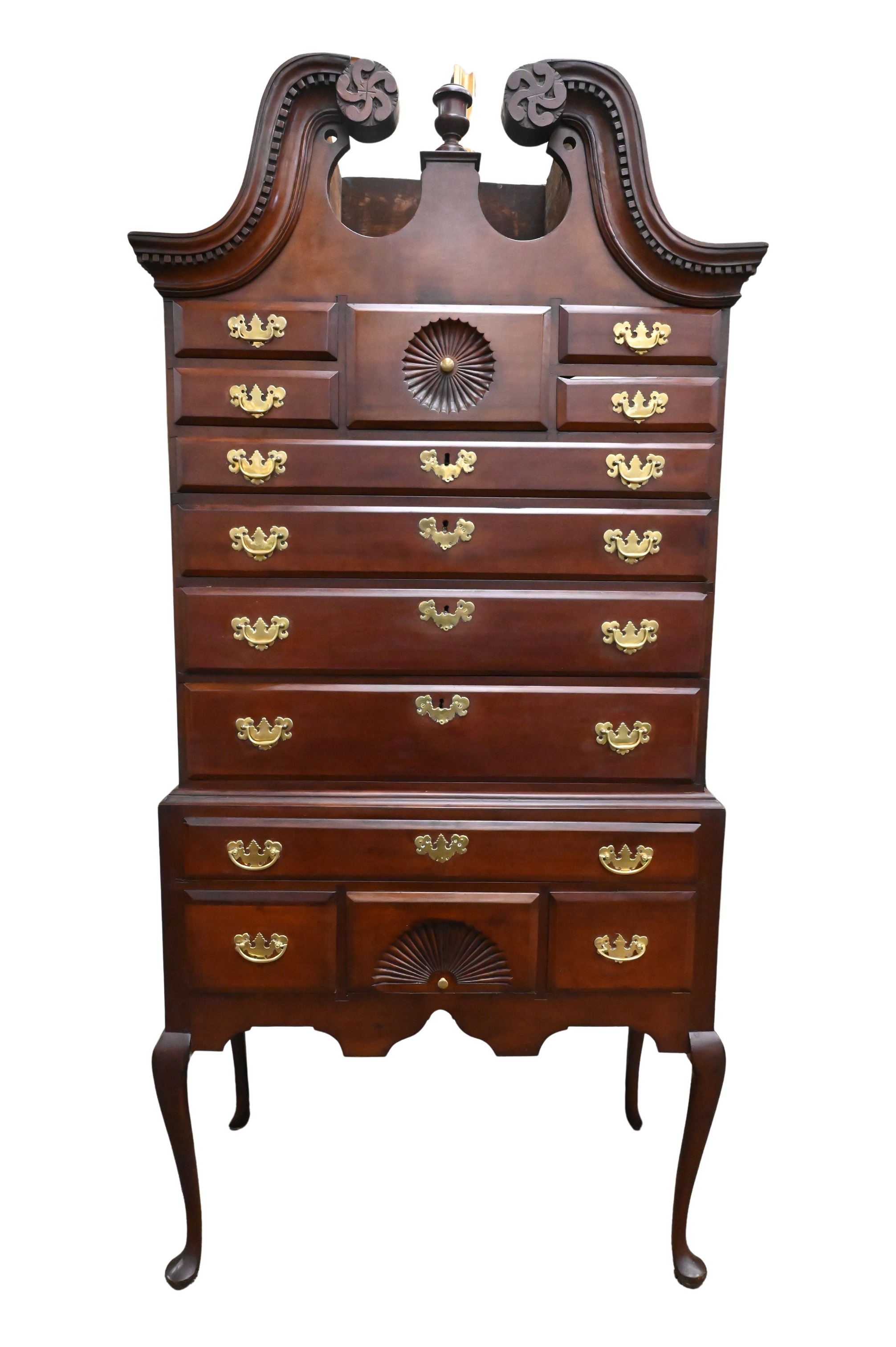 The broken swan’s-neck pediment with pinwheel terminals and central urn finial, the arches with dentil molding, above a case fitted with three short drawers (center fan-carved) over four graduated long drawers; lower section with three short drawers including a central fan-carved drawer, shaped apron, and cabriole legs ending in pad feet.