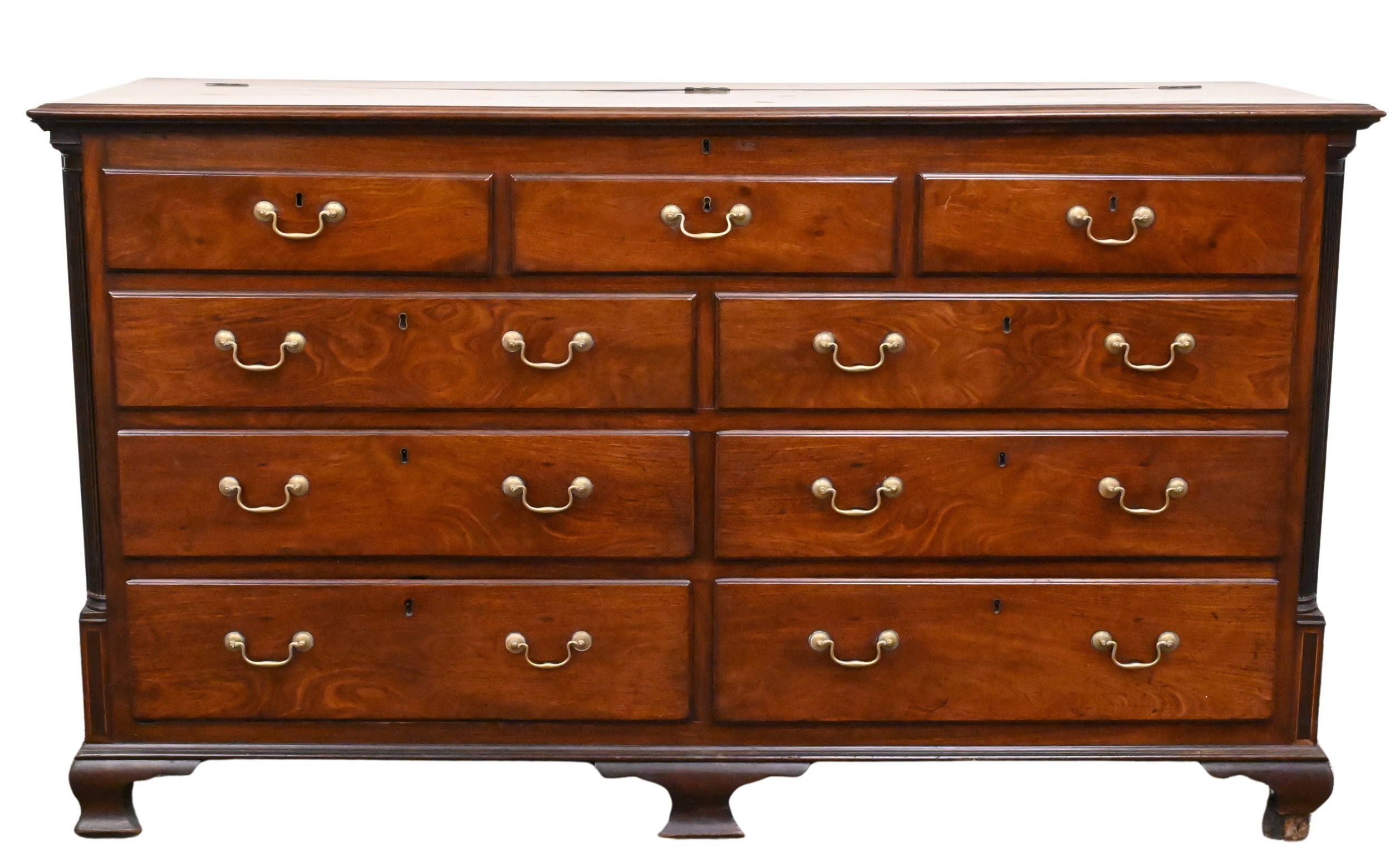 The rectangular molded top above an arrangement of four short drawers over six long drawers, flanked by fluted quarter columns, all raised on bracket feet. Brass bail pulls