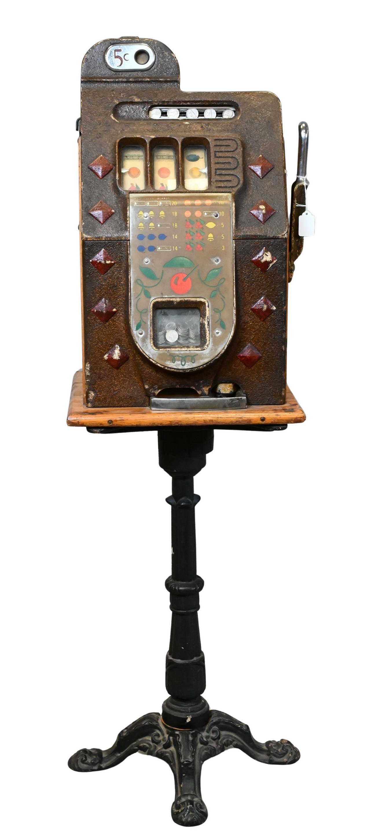 A Mills 5-cent slot machine with three-reel mechanism, painted cast-metal case with decorative panels, coin window, and payout schedule plate. Set on an oak top stand with iron pedestal base. In working condition.