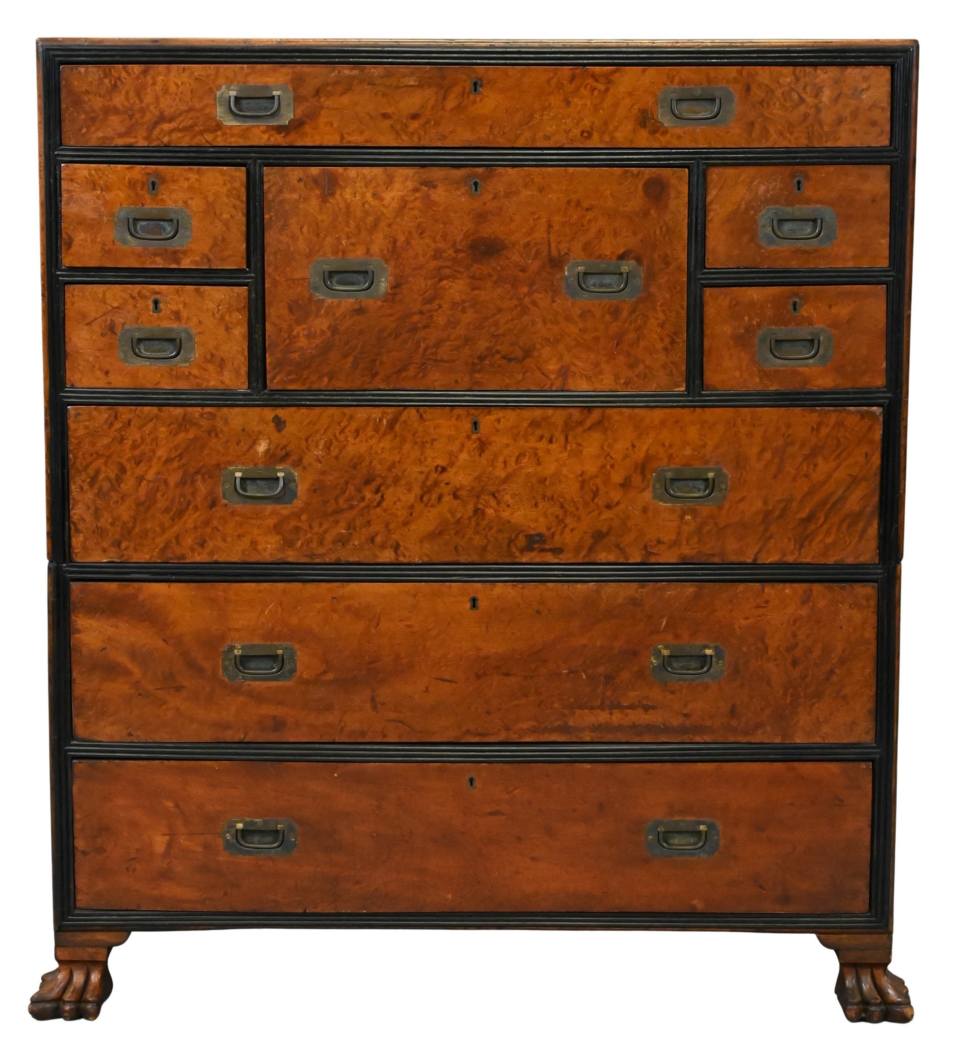 A handsome two-part campaign chest in richly figured burl walnut veneer with ebonized banding, fitted with brass recessed campaign pulls and side carrying handles. The upper section with two short drawers over a bank of four medium drawers, the wide central drawer with a hinged drop-front revealing a fitted writing desk interior. The lower section with two long drawers, the case raised on bold carved paw feet. Classic portable construction and design consistent with 19th-century English campaign furniture.