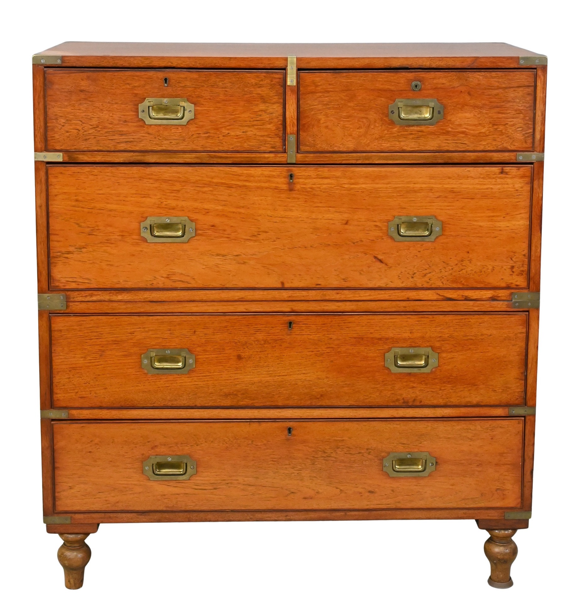 campaign chest fitted with brass recessed campaign pulls and corner mounts, with two short drawers over three long drawers, all raised on turned feet