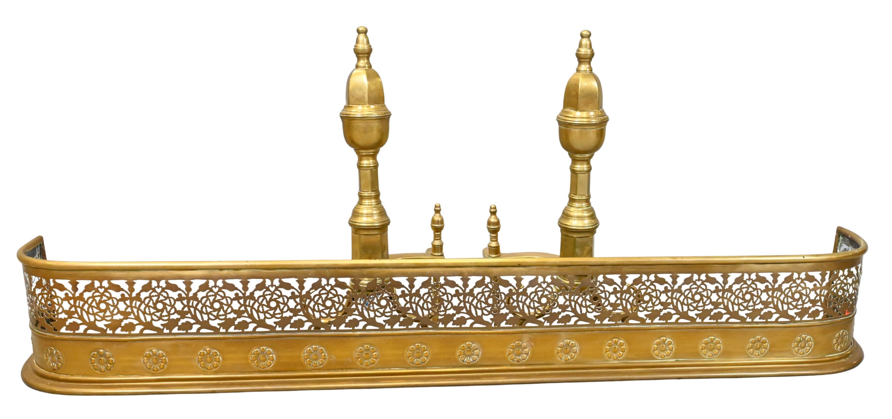 andirons height 15 inches, fender height 10 /2 inches, width 34 1/2 inches