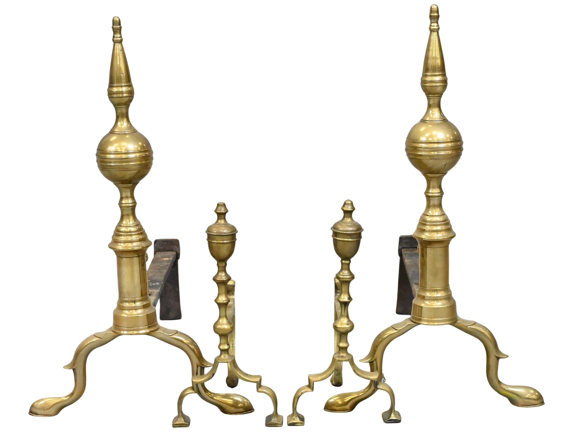 Pair of Federal Brass Steeple-Top Andirons with Large Stops, and Brass Tool Holders