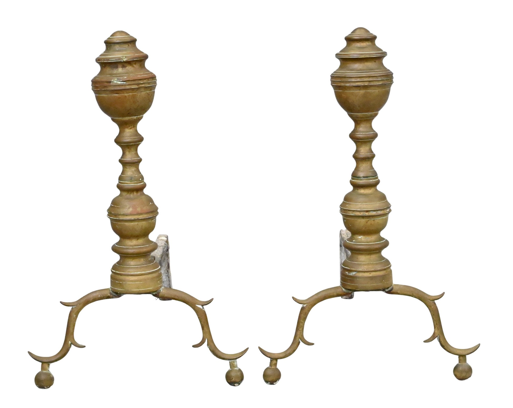 A pair of turned brass andirons with vasiform finials and spurred cabriole legs terminating in ball feet, joined to iron log supports. Classic Federal period design with warm patinated surfaces. 18th/19th century