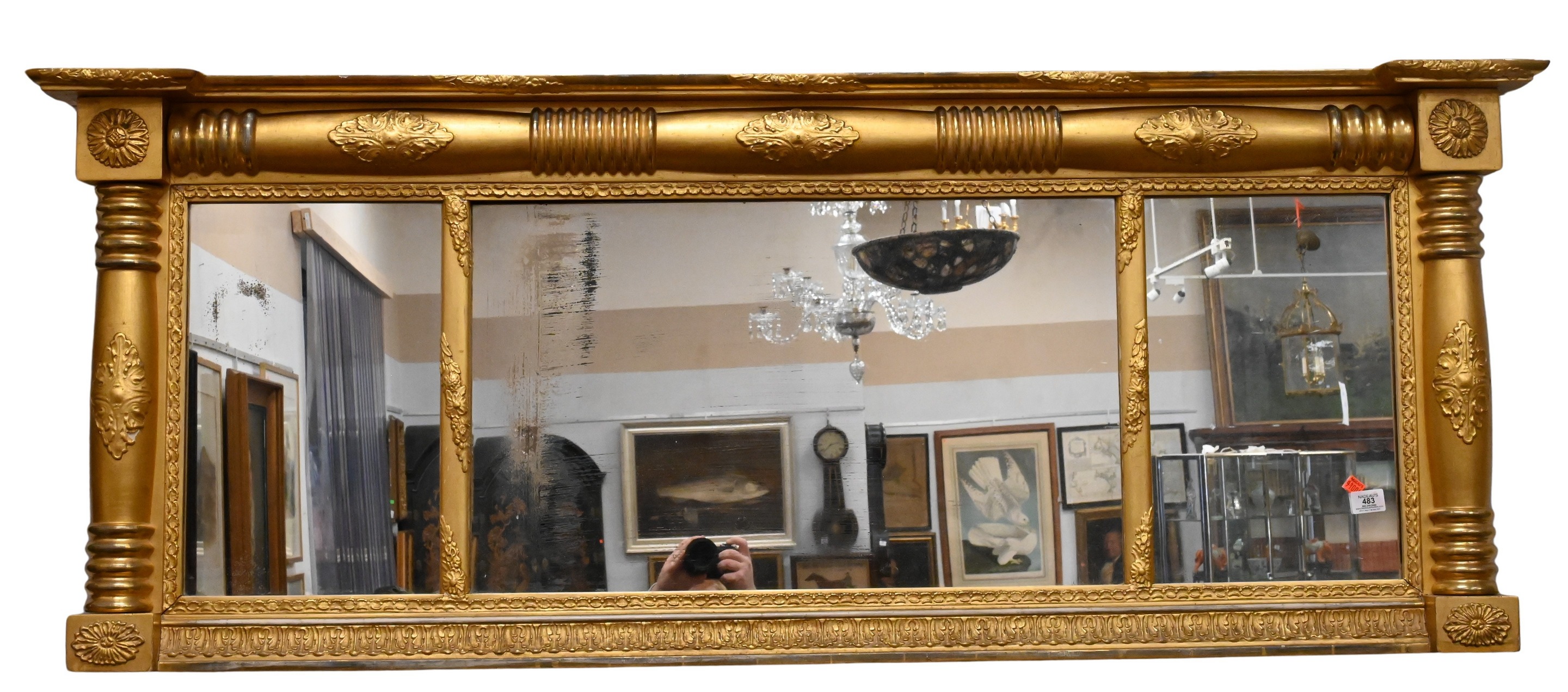 A Federal overmantel giltwood mirror with turned end columns and applied oval paterae, enclosing a tripartite mirror plate within a molded, foliate-bordered frame.