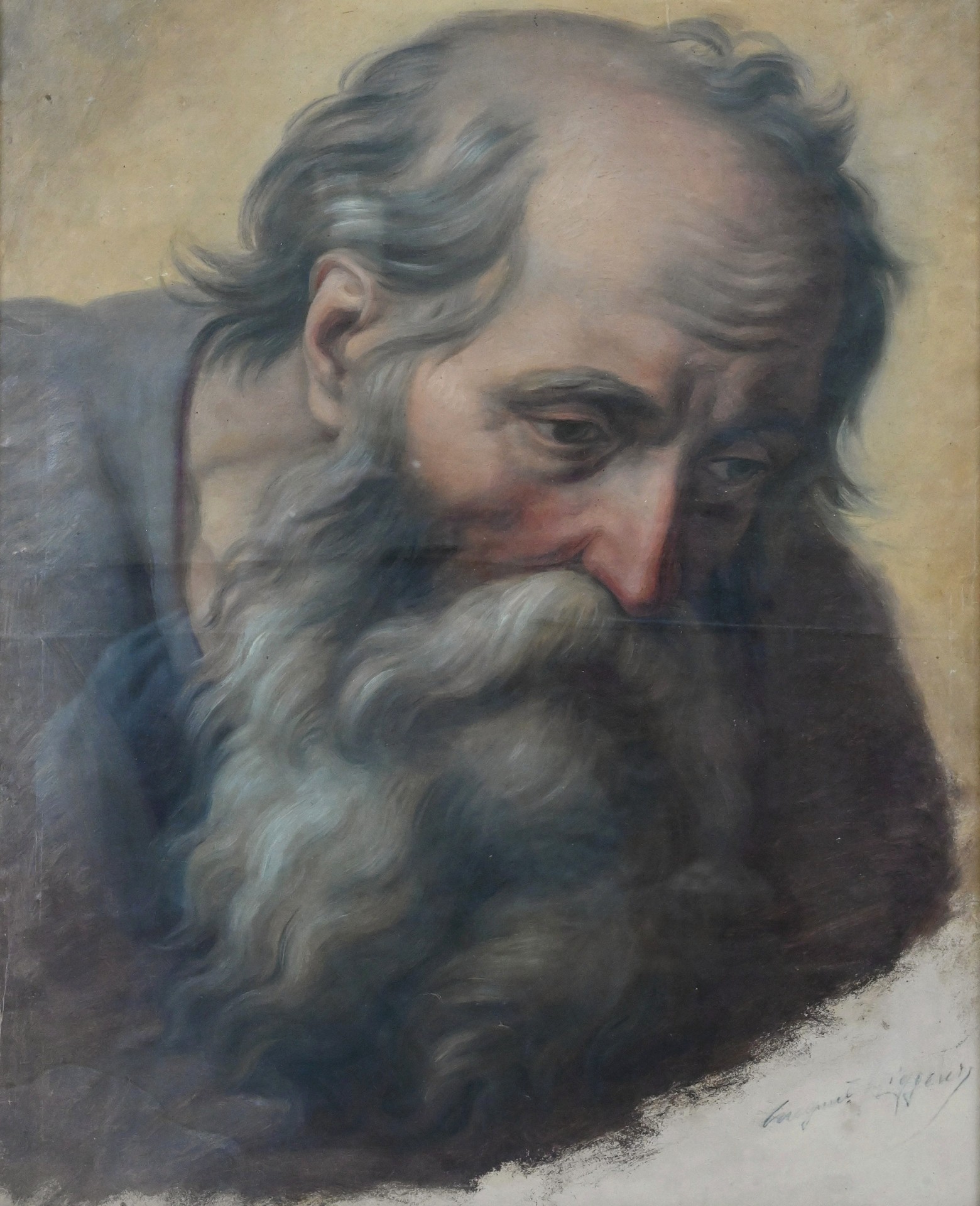 highly expressive study of an elderly man with furrowed brow and downcast gaze, his flowing grey beard and hair modeled with delicate tonal transitions. The somber palette of soft blues and earth tones heightens the introspective character of the sitter, rendered with sculptural depth and psychological intensity