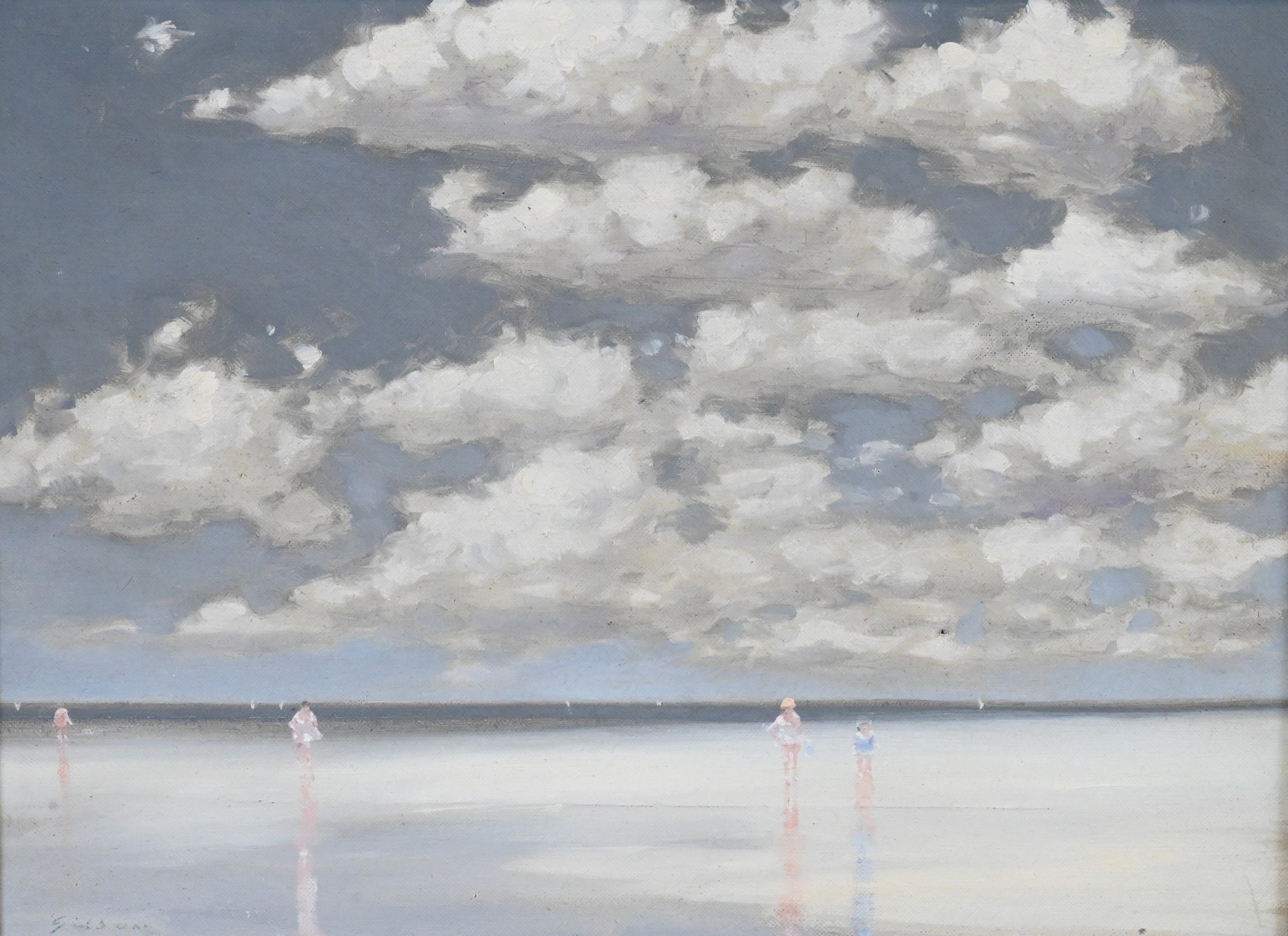 Minimalist beach scene with figures walking along the reflective shoreline, painted in delicate tones of gray, blue, and sand with subtle figures emerging from the expansive seascape.