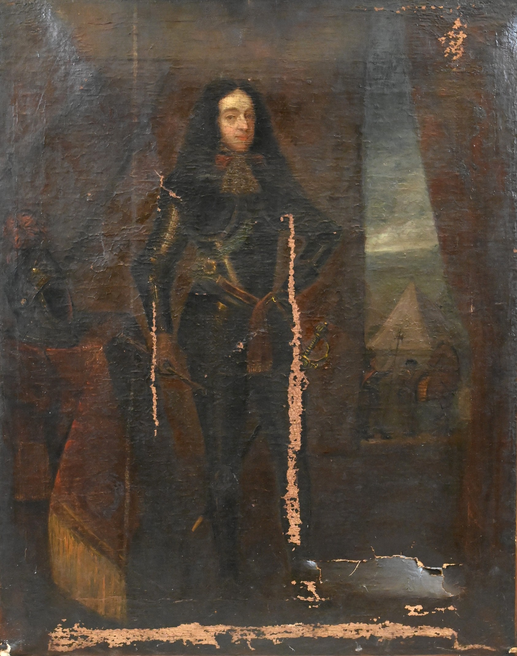 Depicting a standing nobleman in full armor with long curled wig, lace cravat, and red sash, posed with hand on hip before a military encampment with soldiers and tents. Likely representing William III of England, also Prince of Orange, or another high-ranking military commander of the period.