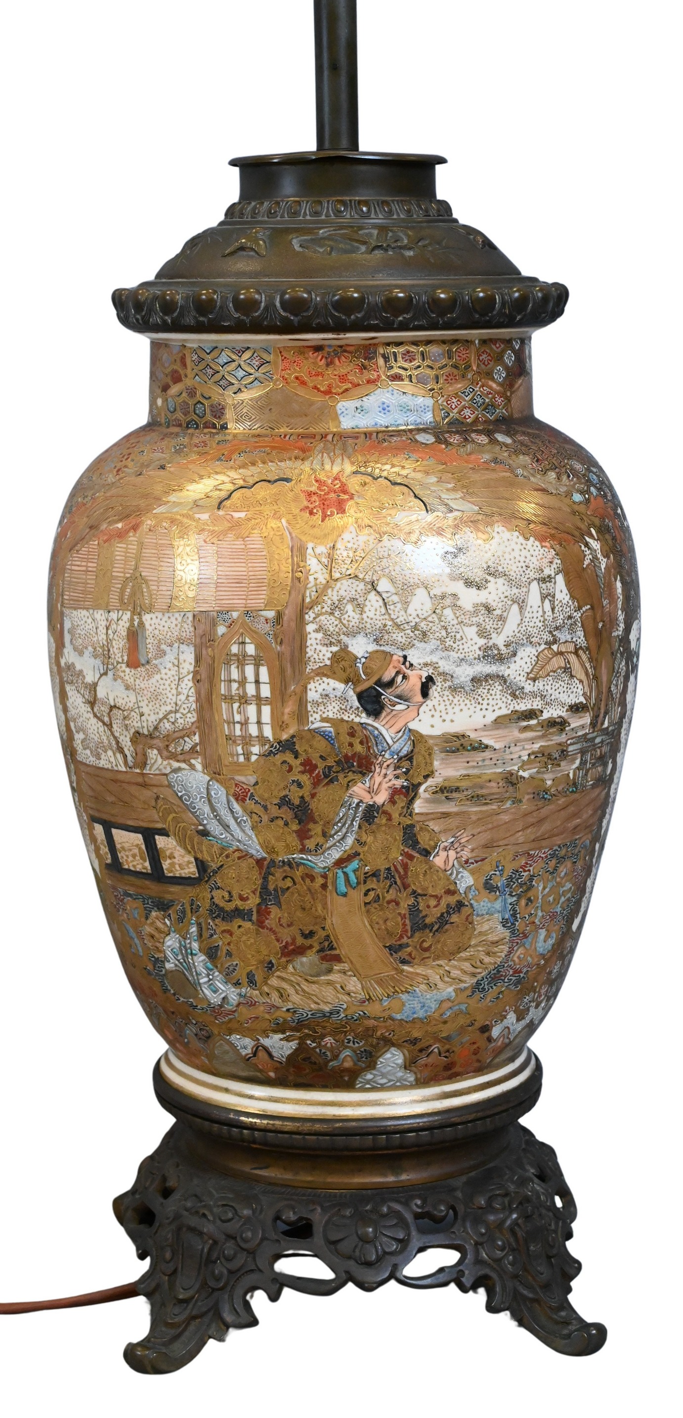 A Japanese Satsuma vase finely painted with gilt and polychrome figural and landscape panels, richly detailed with brocade-pattern grounds. Later mounted with a metal lid and base for use as a lamp.