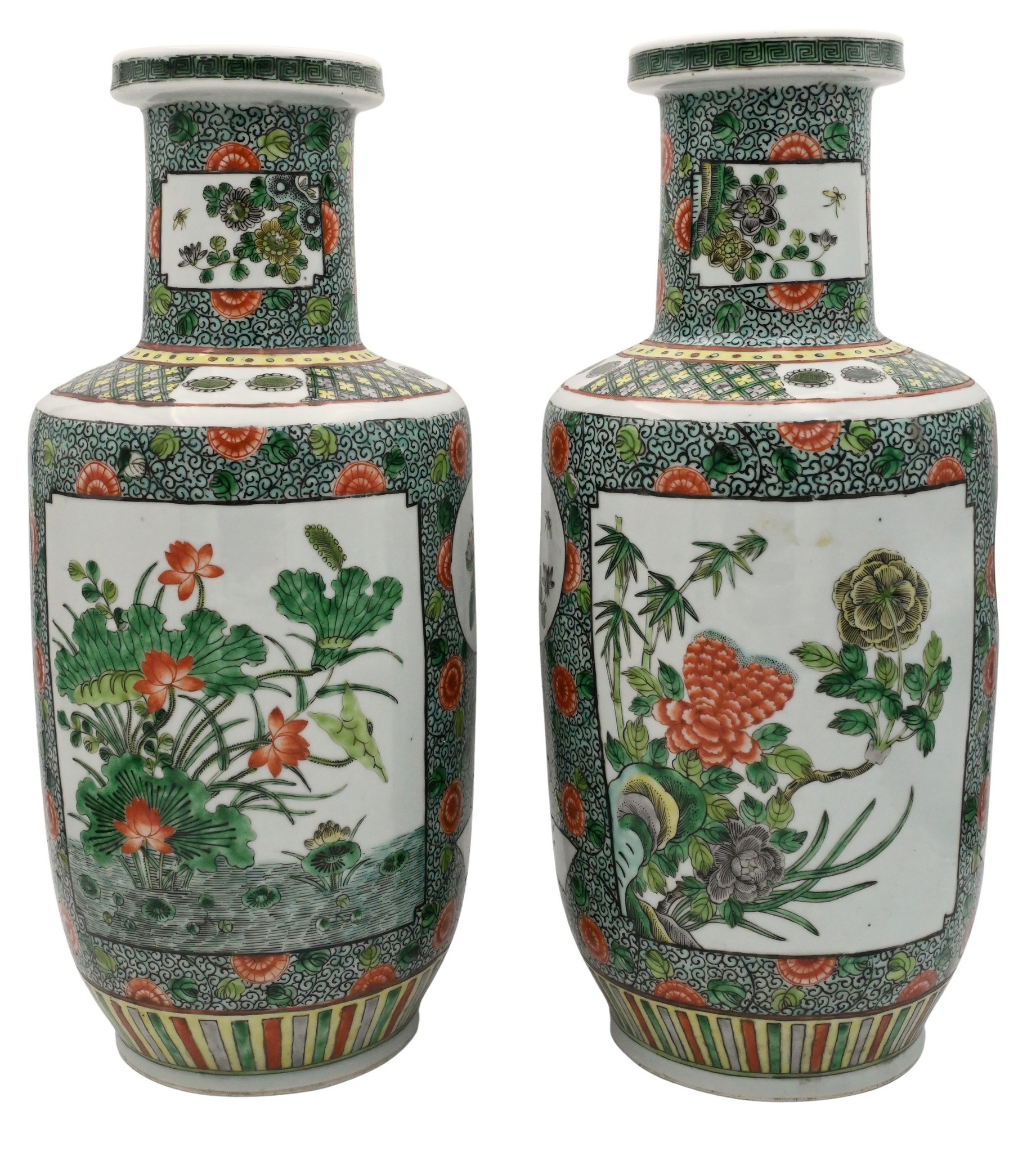 Including a pink-ground vase decorated with roundel reserves of landscape scenes, together with a tall rouleau vase painted with scrolling floral and gourd motifs, inset figural medallions, and inscription, all in famille rose enamels.