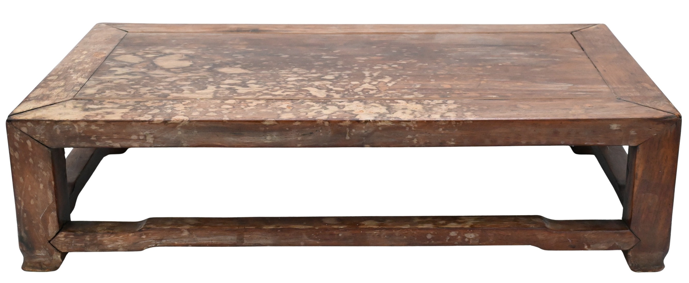 A rectangular Chinese hardwood low table with straight legs joined by side stretchers. height 5 1/2 inches, top 12 1/4″ x 22″ Condition: surface wear, staining, and age-expected imperfections.